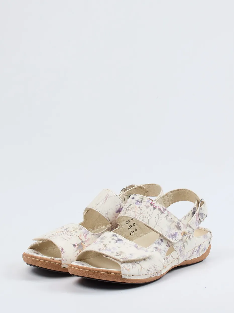 Blütenakzente mit Komfortwirkung.Waldläufer interpretiert mit dieser Komfortsandale ein sommerliches Must-have für entspannte Tage. Die Sandale überzeugt mit ergonomisch gepolstertem Fußbett, weich glänzendem, floral geprägtem Leder in zartem Creme und Lavendel sowie einem rutschhemmenden Kork-Keilabsatz. Zwei Klettverschlüsse und ein silberfarbener Schnallenriemen ermöglichen individuelle Anpassung, während das Lederfutter und die Weite H für spürbaren Tragekomfort sorgen. Der Botanical-Print setzt den Soft-Wellness-Trend geschmackvoll um und wirkt ideal in Kombination mit fließenden Stoffen. Stil und Wohlgefühl in einem – typisch Waldläufer.