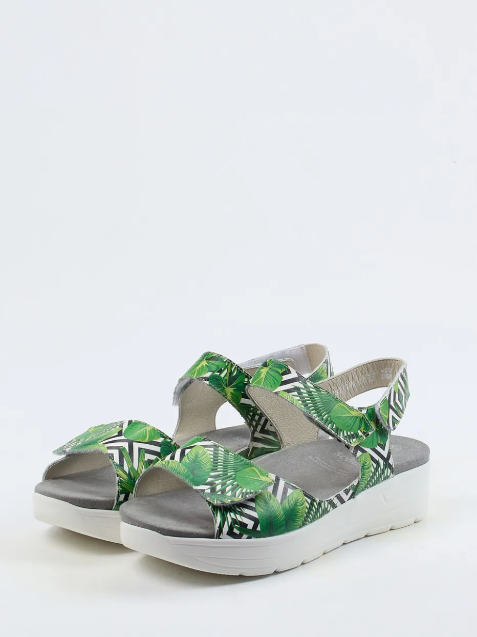 Naturliebe trifft Tragekomfort.Die Marke Solidus bringt mit dieser Komfortsandale ein praktisches Modell für Damen auf den Punkt. Bei Spaziergängen entlang der Strandpromenade oder beim Stadtbummel sorgt das weich gepolsterte Tencel-Korkfußbett für spürbare Erholung. Das geprägte Leder mit matt wirkender Oberfläche zeigt einen blattgrünen Dschungelprint auf schwarz-weißer Basis. Drei Klettverschlüsse ermöglichen präzise Anpassung; das ergonomische Design gibt sicheren Halt. Die weiße PU-Sohle mit 2,5 cm Keilabsatz bietet rutschhemmenden Grip. Botanische Prints und Wellbeing-Design machen die Sandale besonders trendbewusst. Kombiniert zu Leinenhose oder Strandkleid entfaltet sie ihren sommerlichen Charme. Solidus vereint Passform-Komfort mit tropischer Leichtigkeit.