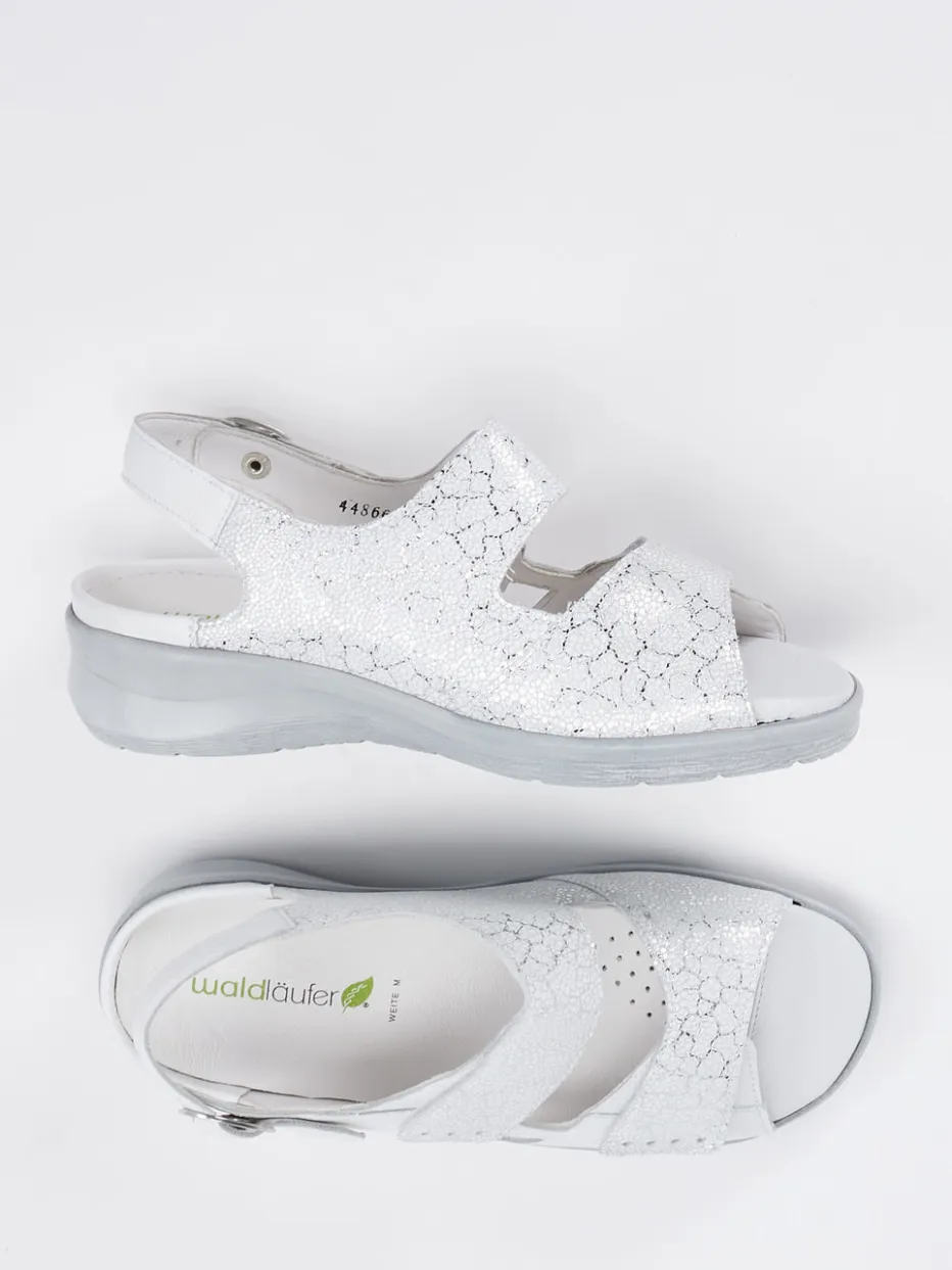 Sommerleicht und alltagstauglich.Die Marke Waldläufer präsentiert eine Damen-Komfortsandale für Freizeit und Alltag. Ihre ergonomisch vorgeformte Sohle mit Luftpolsterfunktion unterstützt ermüdungsfreies Gehen – ideal für längere Strecken. Das geprägte Leder mit genarbter Oberfläche zeigt sich in hellem Offwhite und wird durch silberfarbene Akzente an den Klettverschlüssen ergänzt. Die offene, minimalistische Silhouette mit verstellbarem Fersenriemen sorgt für passgenauen Halt. Ein austauschbares Fußbett bietet zusätzliche Flexibilität. Perfekt kombinierbar zu Leinenhosen oder sommerlichen Casual-Looks. Waldläufer steht für bequeme Lösungen mit wertigem Finish und durchdachten Details.