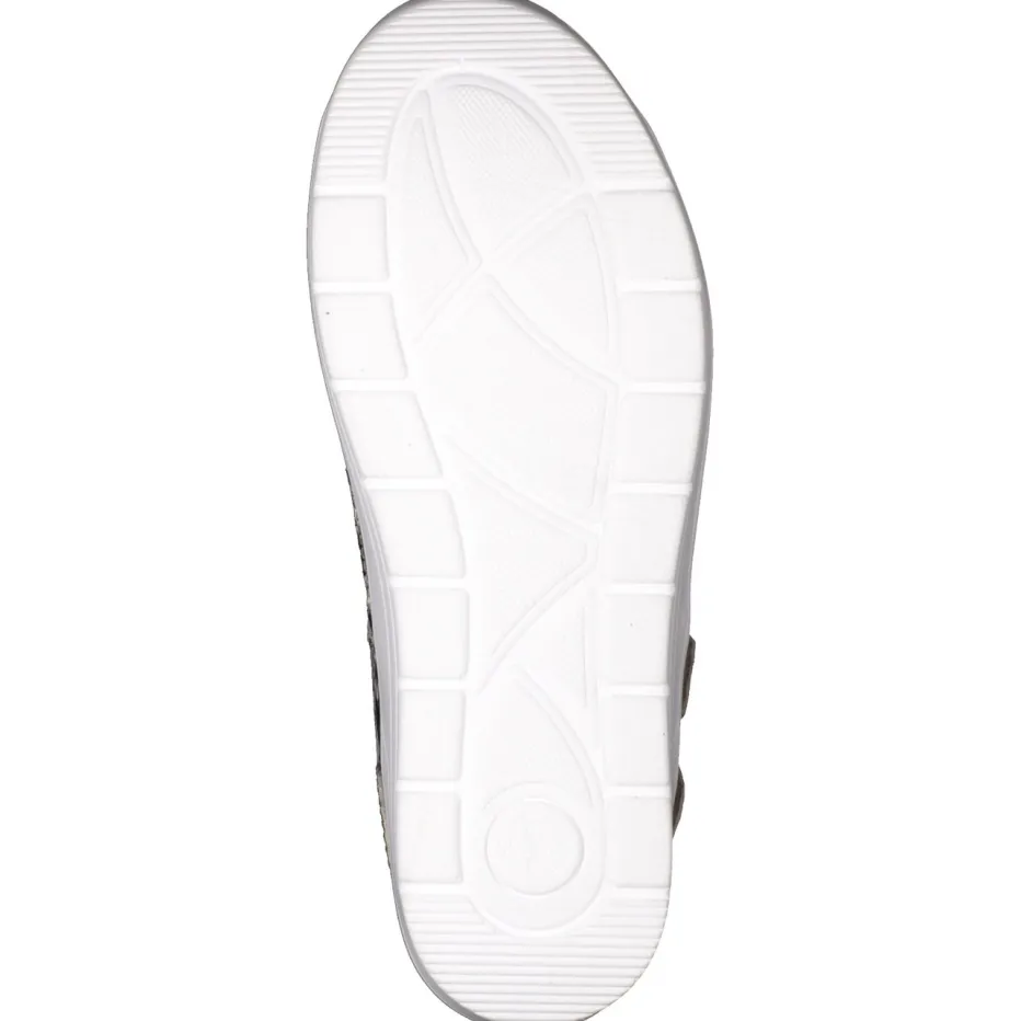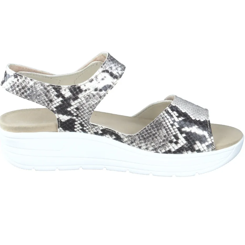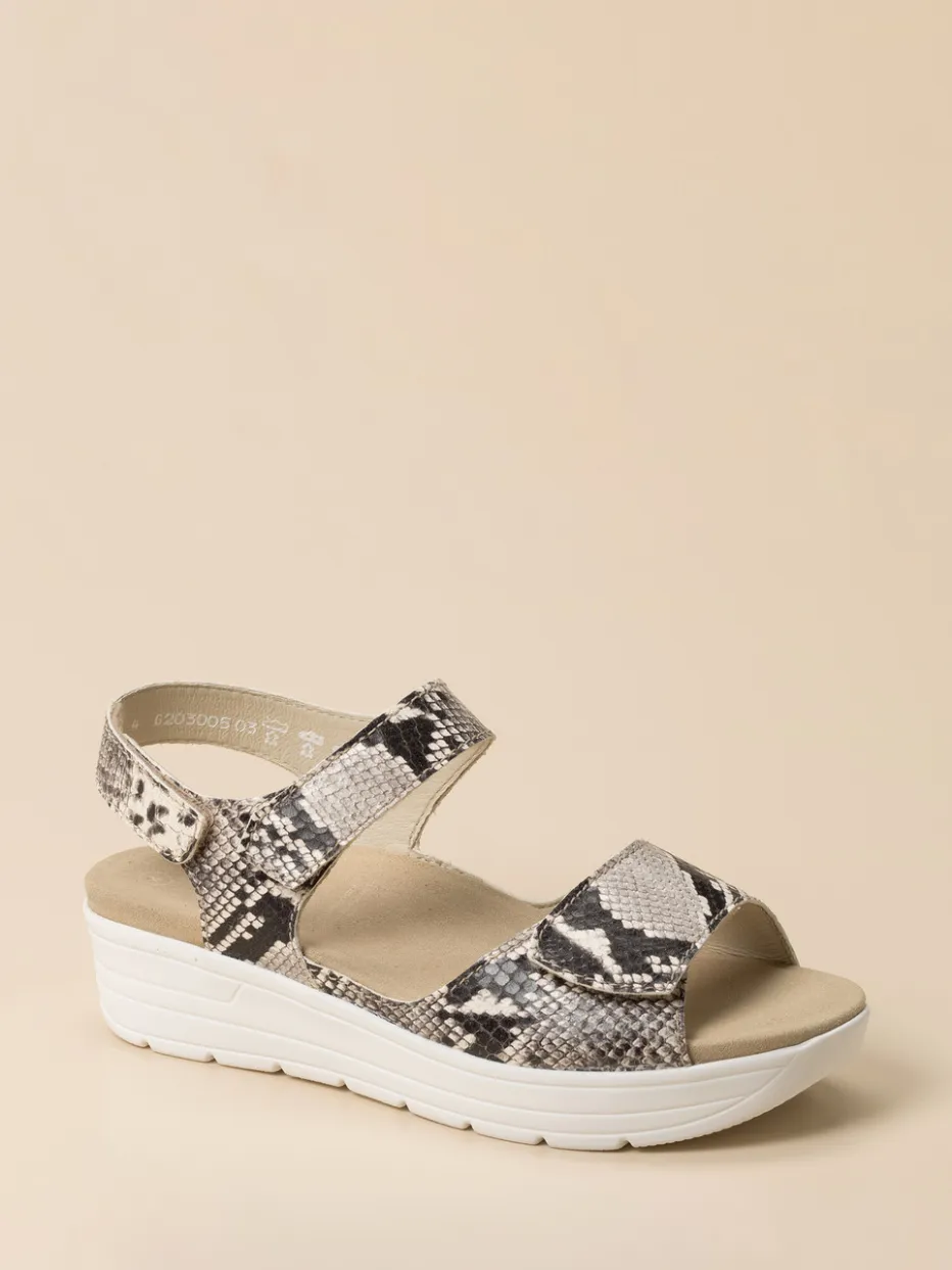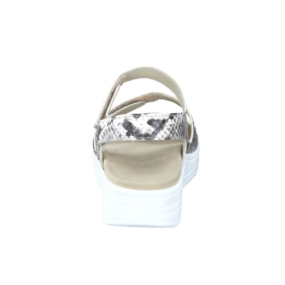 Stilvoll durch den Alltag.Die Marke Solidus präsentiert hier eine komfortorientierte Komfortsandale für Damen. Ideal für entspannte Momente zu Hause oder unterwegs überzeugt die Sandale mit geprägtem Leder in hochwertiger Python-Optik. Der beigegraue Ton wirkt dezent und trendaktuell zugleich, während die breite Riemenstruktur mit zwei Ton-in-Ton-Klettverschlüssen eine passgenaue Weitenregulierung ermöglicht. Die ergonomisch geformte, weiß profilierte PU-Keilsohle bietet Komfort und sicheren Stand. Eine weichgepolsterte, lederbezogene Innensohle unterstützt ganztägiges Tragegefühl und kann gegen Einlagen getauscht werden. Markentypische Qualität und Alltagstauglichkeit im modischen Reptil-Look vereint.