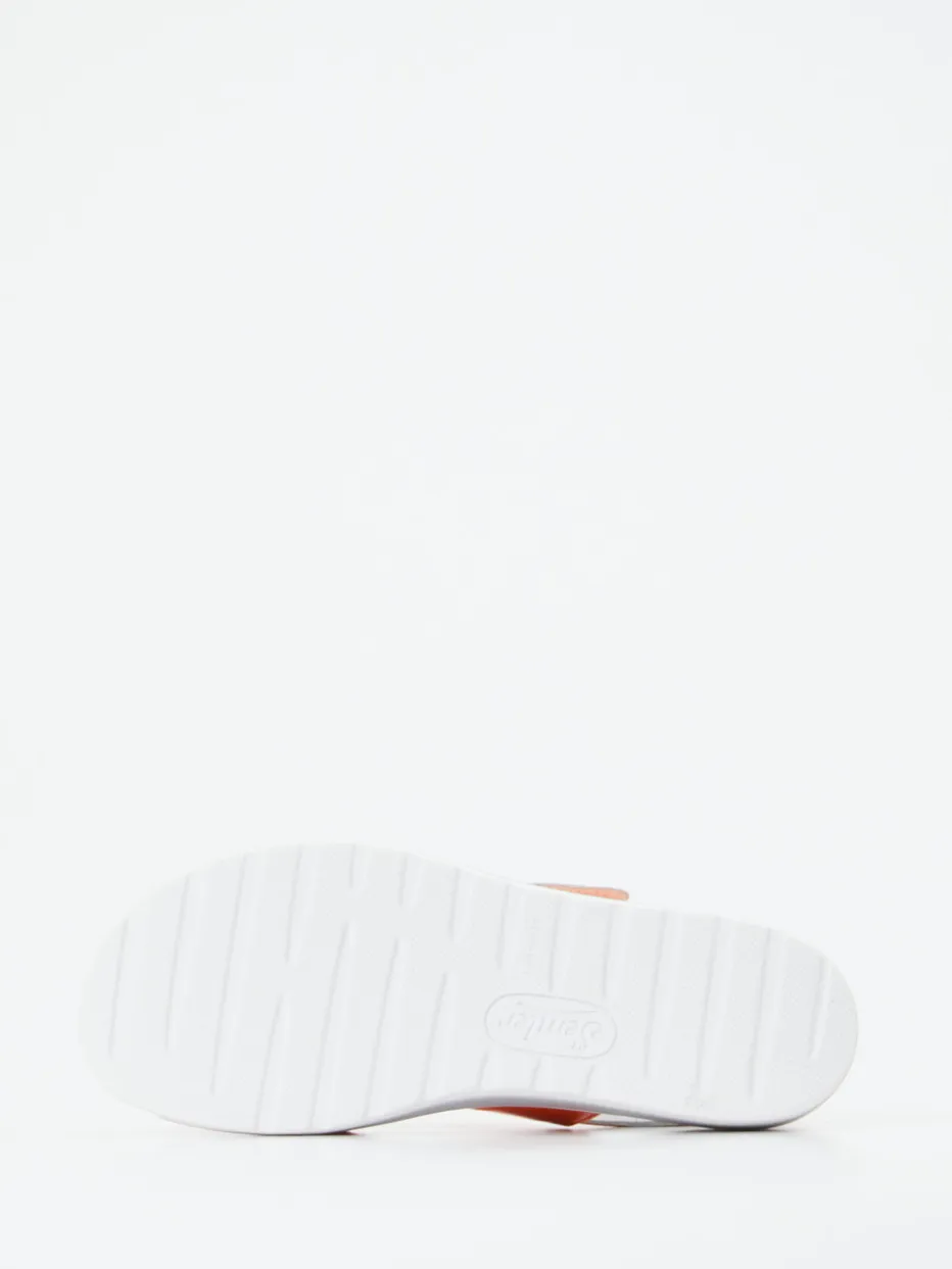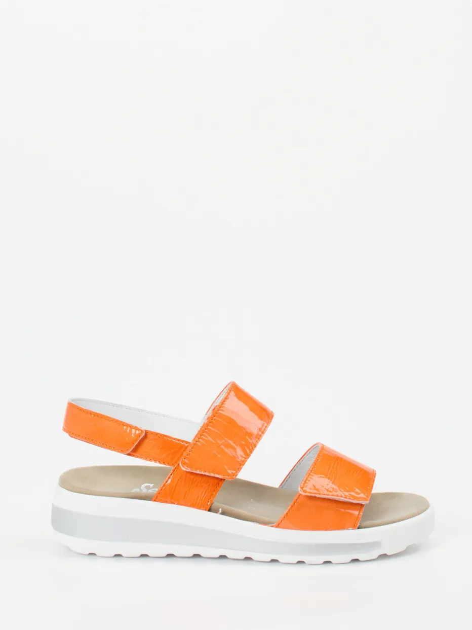 Die offene, ergonomische Form mit gepolstertem Fußbett bietet Komfort bei jedem Schritt. Gefertigt aus glänzendem Lackleder, ergänzt durch weiches Lederfutter, überzeugt sie durch ihr kraftvolles Orange im Color-Blocking-Stil. Breite, tonige Klettverschlüsse sorgen für optimale Anpassung, die leichte PU-Sohle mit 2,5 cm Laufhöhe dämpft angenehm. Die Sandale greift den „Functional Footwear“-Trend auf und lässt sich besonders gut mit luftiger Leinenmode kombinieren.