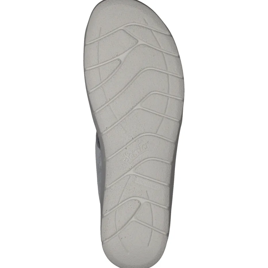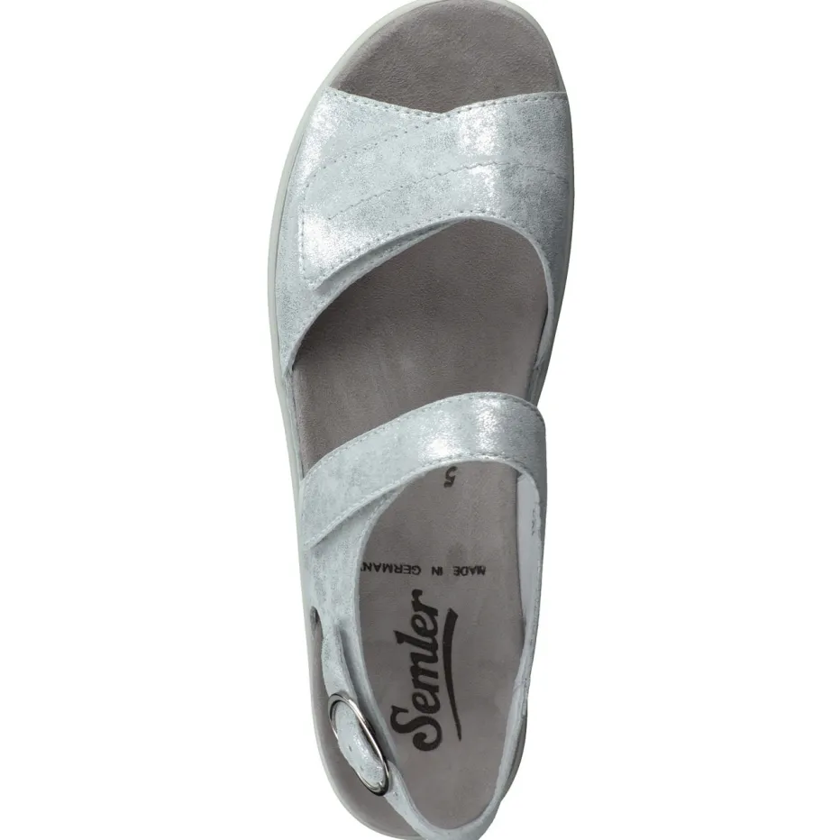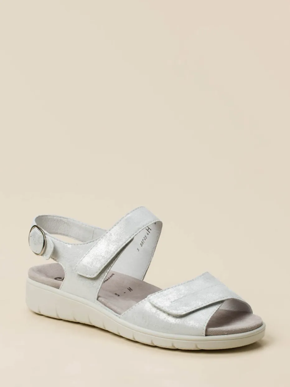 Die Marke Semler präsentiert eine Komfortsandale für Damen, gefertigt aus anschmiegsamem Veloursleder mit Metallic-Finish. Die silberweiße Farbgebung sorgt für einen dezenten Glanz im Look.