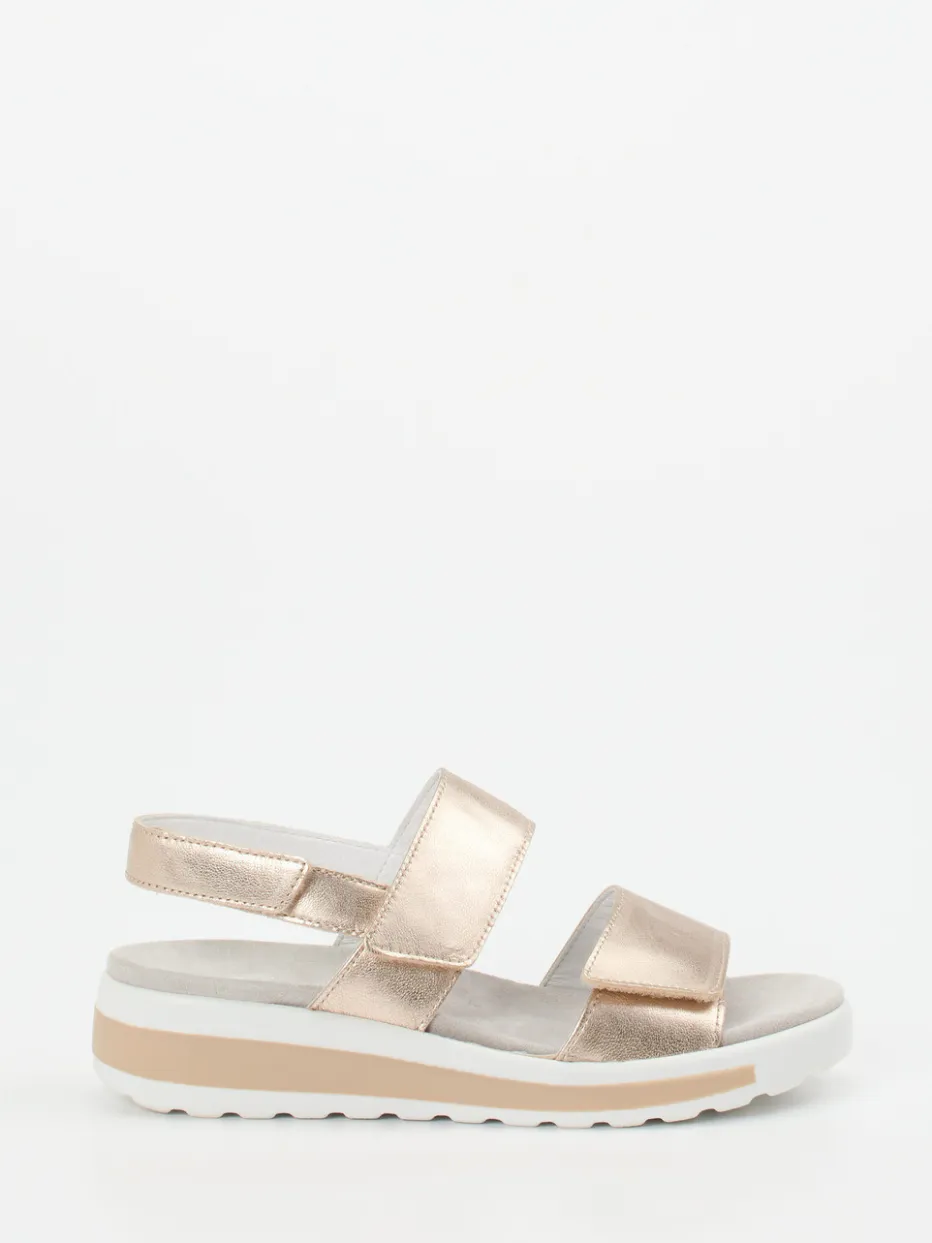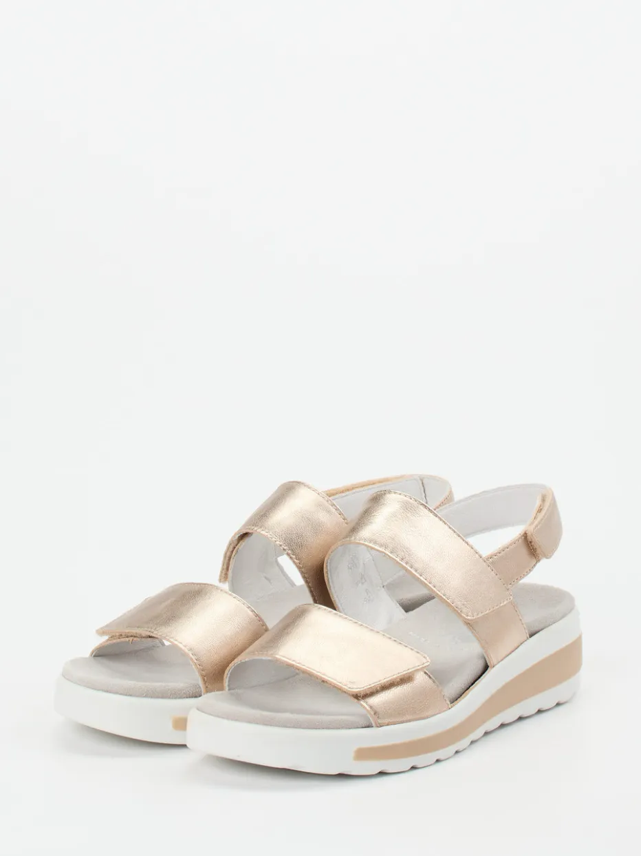 Stilvolle Leichtigkeit für warme Tage.Semler präsentiert eine bequeme Komfortsandale für Damen. Beim entspannten Stadtbummel oder im Urlaub bietet das Modell in edlem Goldton zuverlässigen Komfort. Weiches Metallicleder mit glänzendem Finish sorgt für ein elegantes Erscheinungsbild, während das herausnehmbare, gepolsterte Fußbett ergonomische Unterstützung liefert. Der praktische Klettverschluss erlaubt individuelle Anpassung. Eine dezente, farblich abgesetzte PU-Sohle mit leichter Profilierung ergänzt das offene, sommerliche Design. Minimalistische Formgebung trifft somit auf aktuellen Metallic-Trend. Semler verbindet hochwertige Materialien und Fußkomfort auf anspruchsvolle Weise.