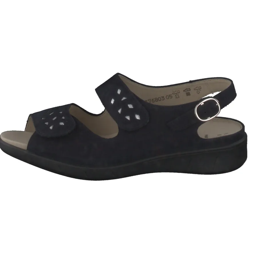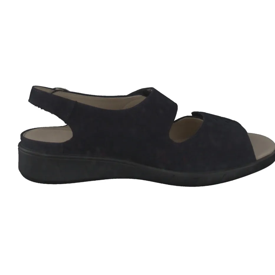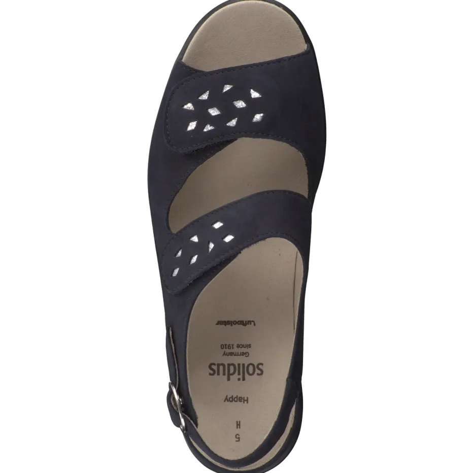 Stilsicherer Komfort für jeden Tag.Solidus präsentiert mit dieser Komfortsandale ein modernes Modell für Damen. Wenn entspannte Tage nach maximaler Bequemlichkeit verlangen, sorgt diese dunkelblaue Nubukledersandale für perfekten Sitz und stilvolle Optik. Die samtig angeschliffene Oberfläche wird von silberfarbenen Cut-Outs auf zwei breiten Klettriemen akzentuiert; ein zusätzlich verstellbarer Fersenriemen mit Schnalle erhöht die Passgenauigkeit. Das ergonomische Luftpolster-Wechselfußbett und die profilierte PU-Sohle bieten sicheren Halt im Alltag. Minimalistische Formgebung und Alltagstauglichkeit machen sie zum idealen Begleiter für komfortorientierte Styles. Mit dem Modell Happy verbindet Solidus anspruchsvollen Komfort mit dezenter Eleganz.