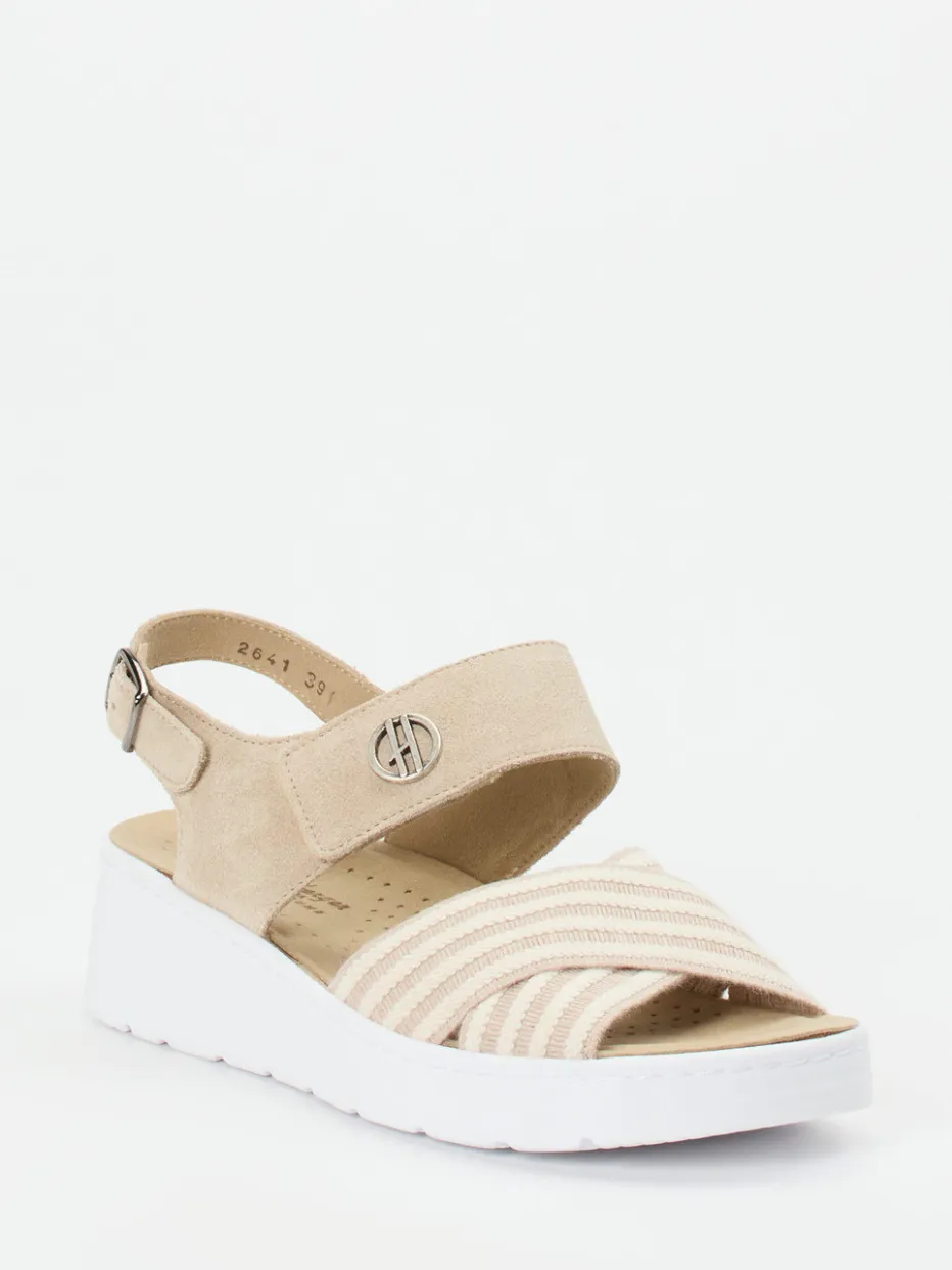 Für entspannte Stunden bei warmem Wetter überzeugt die Komfortsandale durch ihr ergonomisches Design mit weich gepolsterter Innensohle und einer erhöhten PU-Keilsohle. Das beige Textil mit dezentem Streifenmuster wirkt weich und matt, während der verstellbare Fersenriemen durch Schnalle und Klettverschluss individuell angepasst werden kann. Ein metallisches Logo-Emblem und sichtbare Ziernähte ergänzen das minimalistische Design. Der Look passt ideal zu Leinenhosen oder sommerlichen Blusen.