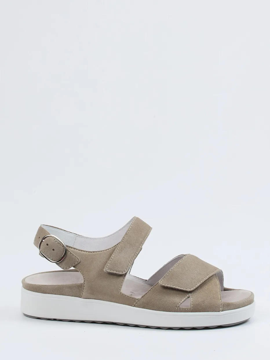 Sommerlicher Komfort für jeden Tag.Semler präsentiert eine Damen-Komfortsandale, die modisch und funktional zugleich ist. Ideal für spontane Spaziergänge oder entspannte Stunden auf der Terrasse: Das samtig angeschliffene Veloursleder in einem eleganten Sandbeige verleiht dieser Sandale eine dezente Leichtigkeit. Breite, verstellbare Riemen mit Klettverschluss und ein zusätzlicher Fersenriemen mit silberfarbener Schnalle sorgen für optimalen Halt. Die ergonomisch geformte PU-Sohle mit Luftpolster bietet ausgezeichnete Dämpfung, während das auswechselbare Fußbett auch orthopädische Einlagen zulässt. Das dezente Design folgt dem Quiet-Luxury-Trend der Saison. Semler steht für kompromisslosen Komfort mit stilvoller Zurückhaltung.