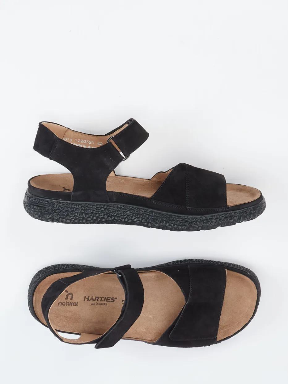 Schwarz trifft Komfort – minimalistisch gedacht.Die Komfortsandale von Hartjes überzeugt mit hochwertigem Material und durchdachter Funktion für den Sommer. Für entspannte Tage zuhause oder in der Freizeit bietet das Modell bequemen Halt und dezente Eleganz. Gefertigt aus samtig angeschliffenem, schwarzem Veloursleder mit Ton-in-Ton-Nähten, kombiniert die Sandale eine ergonomische Form mit einem gepolsterten Leder-Innenfutter. Die breiten Klettverschlüsse erlauben individuelle Anpassung, während die strukturierte, rutschfeste Gummisohle auf Kork-Basis optisch und funktional überzeugt. Elemente wie ein austauschbares Fußbett und der minimalistische Look machen sie zu einem Trendstück im Stil von Quiet Luxury. Perfekt zu natürlichen Materialien wie Leinen oder Baumwolle. Höchster Komfort in durchdachtem Design – typisch Hartjes.