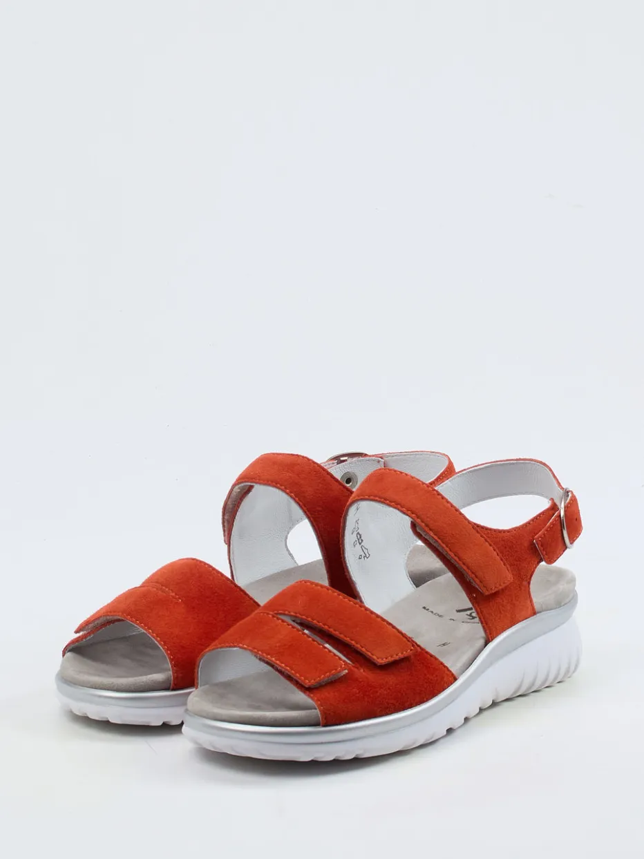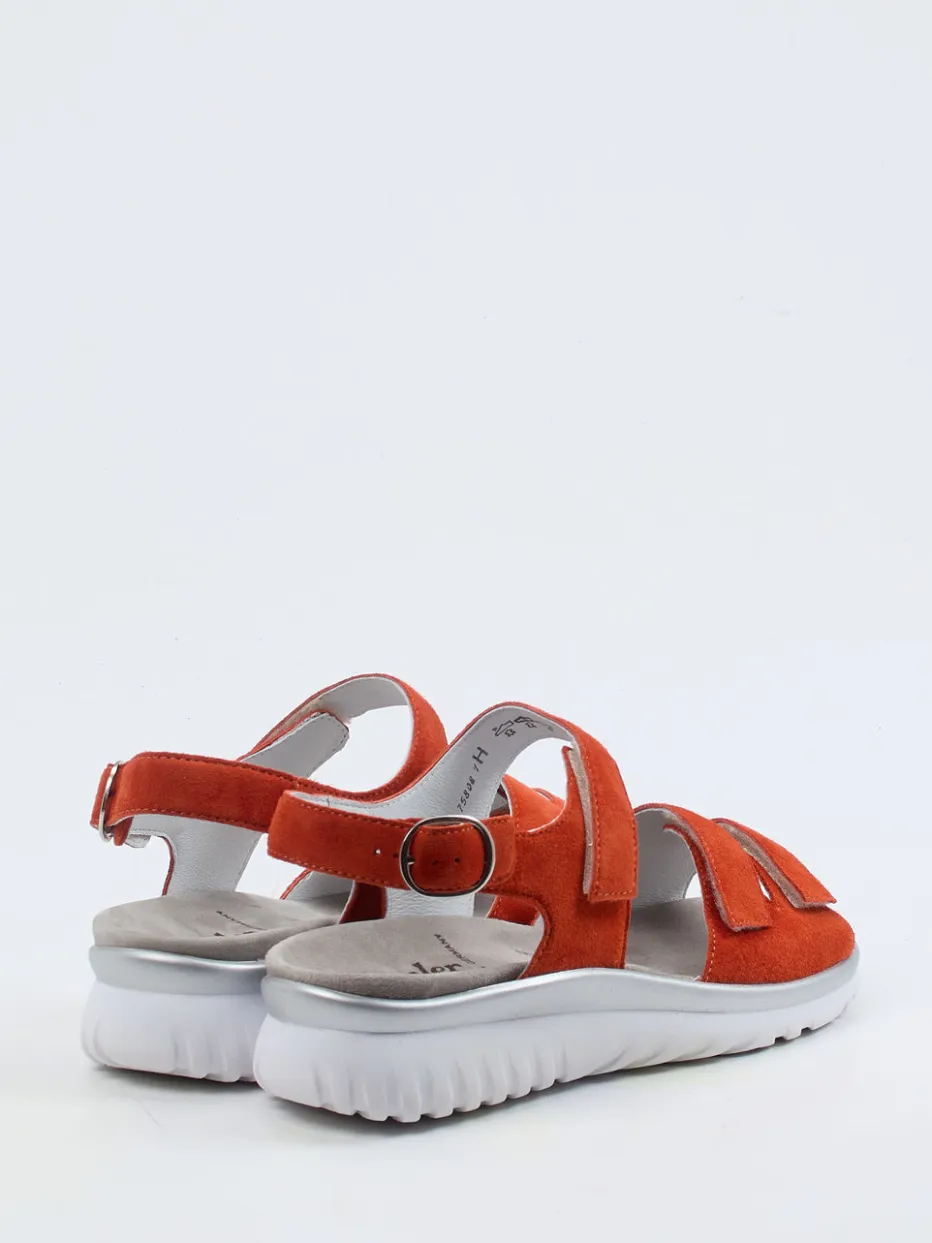 Leichter Komfort für aktive Sommertage.Semler präsentiert mit dieser Komfortsandale ein Damenmodell aus der Linie Laura in Weite H. Ob beim Stadtbummel oder auf Reisen – diese Sandale vereint angenehmen Tragekomfort mit einem modernen Look. Das fein verarbeitete Veloursleder zeigt sich samtig in intensivem Orange, ergänzt durch einen silberfarbenen Akzentstreifen zwischen Keil- und Laufsohle. Zwei Klettverschlüsse bieten individuelle Verstellmöglichkeiten, während das herausnehmbare, gepolsterte Fußbett den Tragekomfort abrundet. Die weiße Gummisohle sorgt für guten Halt im Alltag. Im Stil der „Soft Tech Comfort“-Trends lässt sich das Modell stilvoll mit Leinenblusen oder sommerlichen Hosen kombinieren. Ein Komfortupgrade für warme Tage – mit Semler-typischer Passformpräzision.