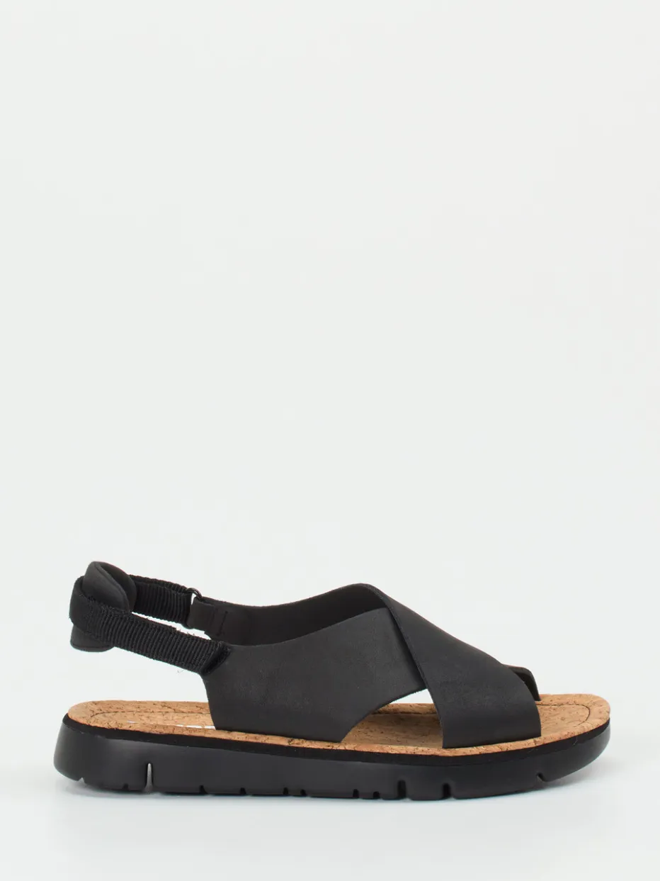 Modern durch den Sommer.Camper präsentiert mit dieser Komfortsandale für Damen eine minimalistische Interpretation urbaner Sommermode. Ideal für lange Tage unterwegs überzeugt das Modell durch hochwertiges Kalbleder mit matter Oberfläche und ergonomisches Fußbett aus recyceltem PET und Korkanteilen. Das schwarze Design mit Kreuzriemen und elastischem Fersenriemen verleiht der offenen Silhouette eine klare, funktionale Ästhetik. Die griffige Gummisohle mit EVA-Dämpfung sorgt für Stabilität und Leichtigkeit – perfekt für Freizeit und Urlaub. Kombiniert zu Leinenhosen oder luftigen Kleidern entsteht ein lässig-puristischer Look. Komfort und Stil – im typischen Camper-Spirit vereint.