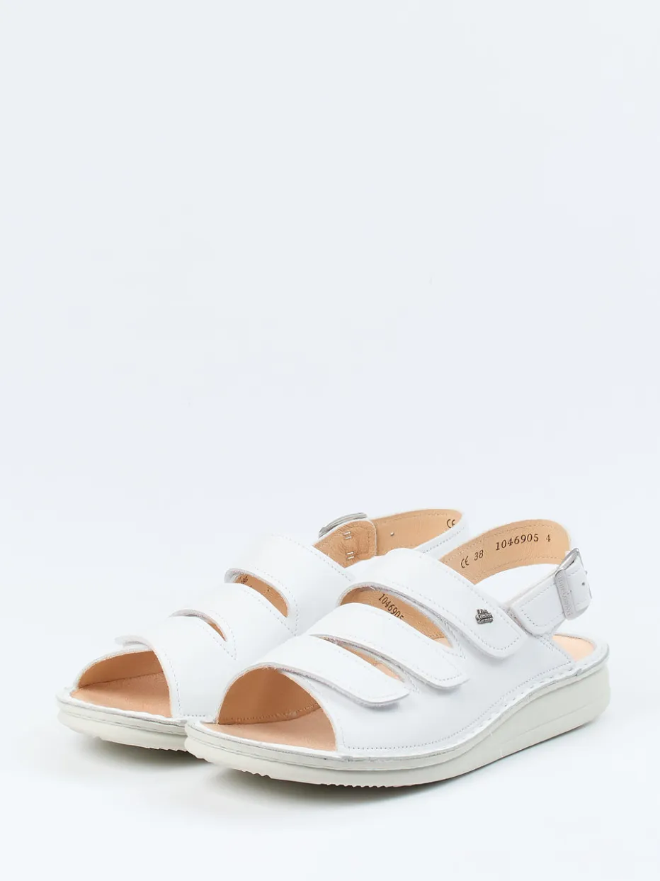 Optimale Unterstützung für entspannte Sommertage.Finn Comfort präsentiert mit dieser Komfortsandale ein durchdachtes Modell für Damen. Ideal für alltägliche Wege oder längere Stadtspaziergänge bietet sie mit weichem, weißem Kalbleder und samtig matter Oberfläche ein angenehmes Tragegefühl. Drei breite Klettverschlüsse und ein verstellbarer Fersenriemen sorgen für passgenauen Sitz. Die ergonomische Decksohle ist mit einer Korkausbettung ausgearbeitet und lässt sich bei Bedarf austauschen. Silberfarbene Schnallen, sichtbare Kontrastnähte und eine profilierte PU-Sohle unterstreichen die funktional-minimalistische Ästhetik. Gut kombinierbar mit luftigen Leinenhosen oder entspannten Freizeit-Looks. Langlebiges Design für Komfort mit orthopädischem Anspruch.