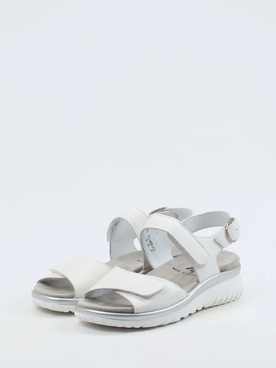 Für Alltag und Freizeit gemacht, punktet diese Sandale durch ergonomisch designte Laufsohle und weiches Kalbleder mit matter Oberfläche. Klettverschlüsse und ein verstellbarer Fersenriemen mit Metall-Schnalle sorgen für optimale Passform. Dezente Steppnähte und eine silberfarbene Zwischensohle setzen stilvolle Akzente. Die herausnehmbare Innensohle aus Veloursleder unterstützt bei Bedarf auch eigene Einlagen. Das cleane Design in Weiß trifft auf Funktionalität im Trendstil „Quiet Luxury“.