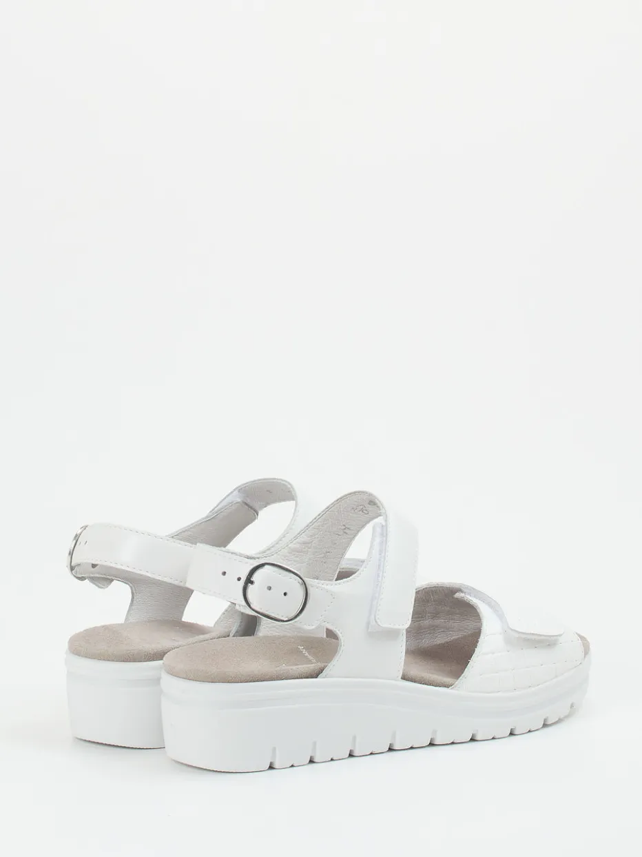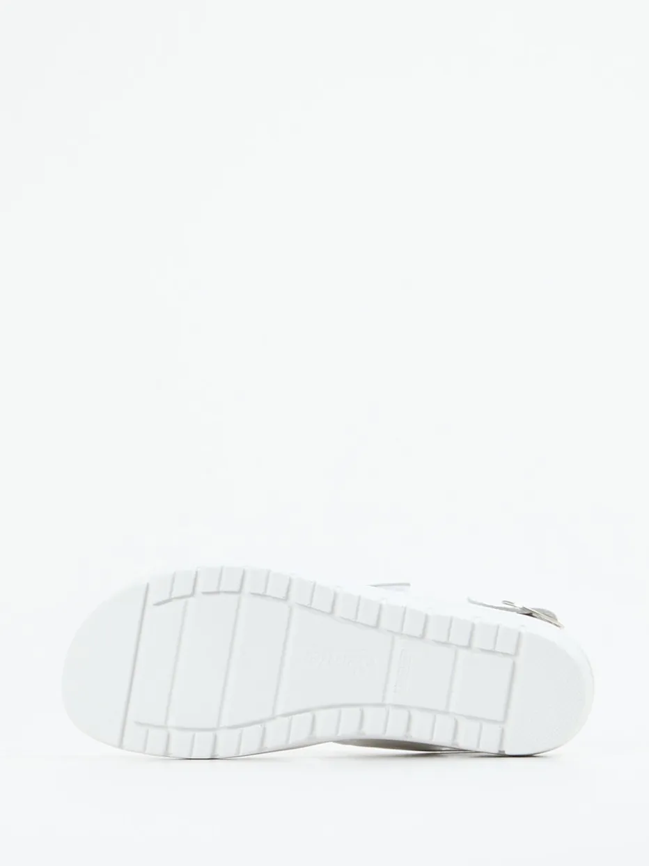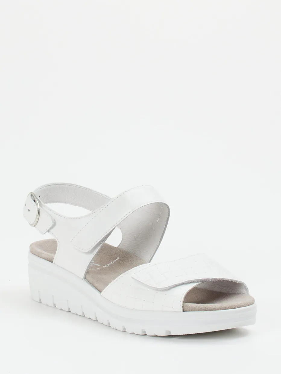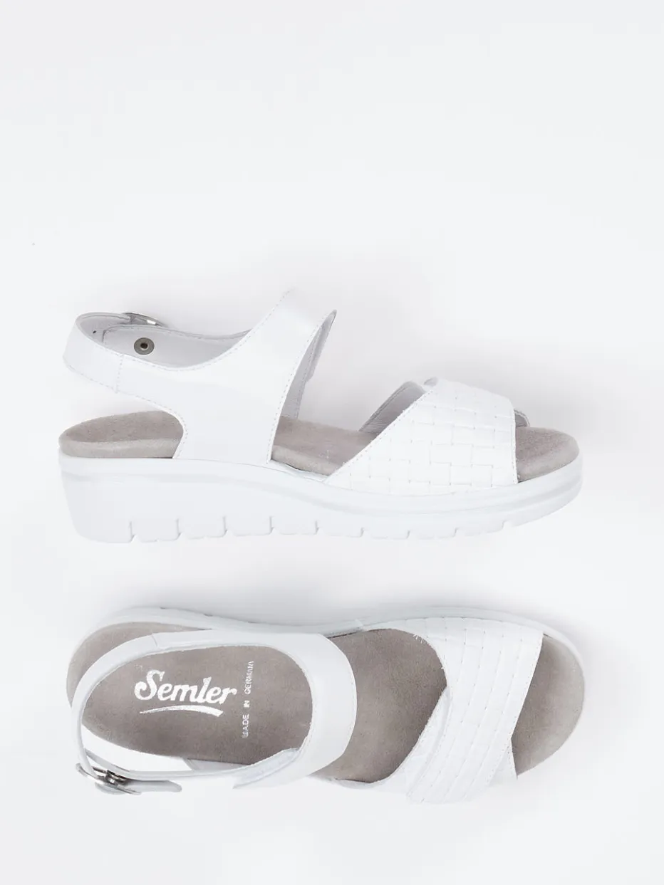 Semler präsentiert eine Damen-Komfortsandale mit Fokus auf Funktion und Stil. Aus robustem Kalbleder gefertigt, kombiniert diese weiße Sandale mit samtig gepolsterter Velours-Innensohle und ergonomischer Keilsohle Komfort mit minimalistischer Ästhetik.