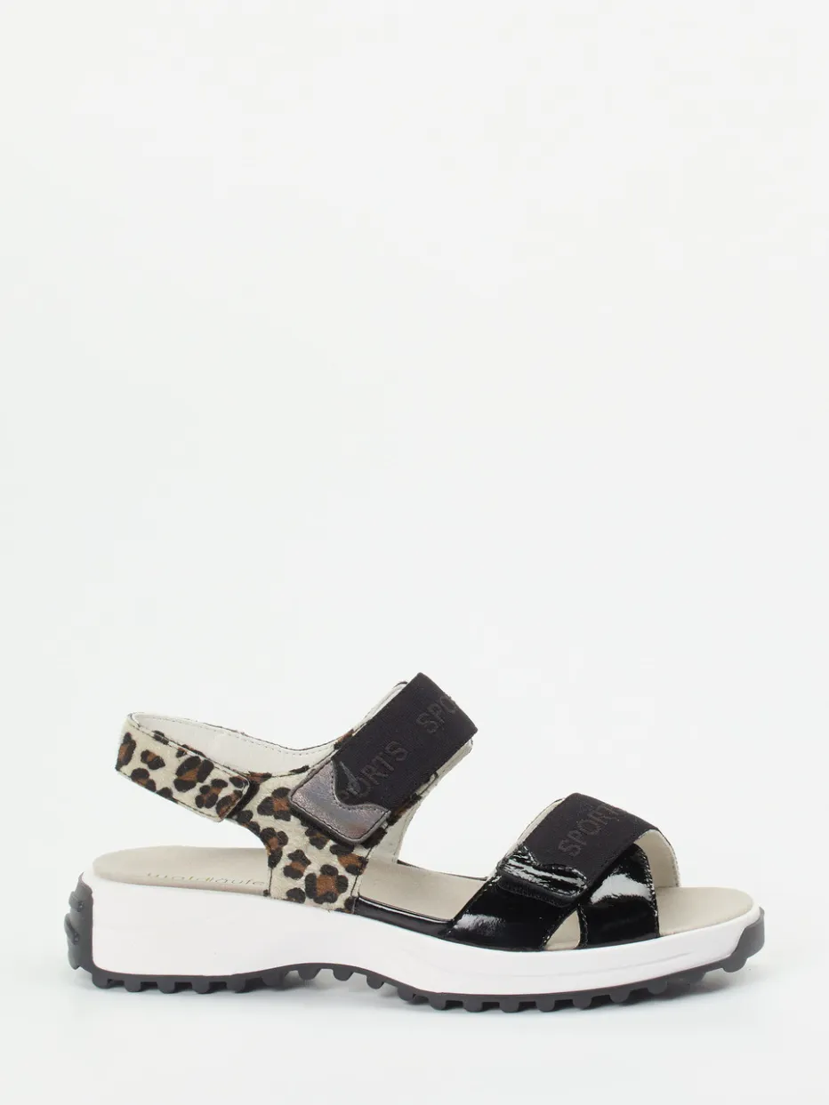 Das schwarze Lackleder trifft auf samtig bedrucktes Druckleder in Leo-Optik und verleiht den offenen Riemensandalen einen auffälligen Streetwear-Charakter. Klettverschlüsse mit ‚SPORTS‘-Schriftzug sorgen für einfaches Anpassen, während die profilierte Gummisohle mit Luftpolster Trittfestigkeit und Dämpfung garantiert. Dank ihrer Weite H und wechselbarer Einlegesohle eignen sich die Sandalen auch für orthopädische Einlagen. Kombiniert mit leichter Sommermode ein stylischer Akzent.