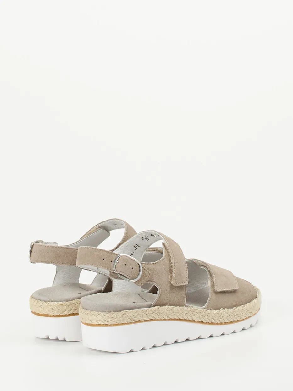 Stilvoll komfortabel durch den Sommer.Die Komfortsandale von Semler bringt mit ihrer ergonomischen Form und hochwertigen Verarbeitung ehrlichen Komfort in die Freizeitgarderobe. Ideal für warme Tage, überzeugt das Modell aus feinem Kalbleder in Veloursqualität – matt angeschliffen für eine dezente Textur. Die taupefarbene Optik in Kombination mit dem beigen Jute-Einsatz an der Sohle setzt auf Natürlichkeit. Zwei Klettverschlüsse und ein Fersenriemen mit silberfarbener Schnalle sorgen für passgenauen Sitz, während die weiße PU-Sohle rutschfest und flexibel ist. In Weite H und mit herausnehmbarem Fußbett ist die Sandale auch orthopädisch durchdacht. Lässt sich mühelos mit Leinenhose oder Sommerrock kombinieren. Nachhaltiger Komfort für entspannte Sommertage – made by Semler.