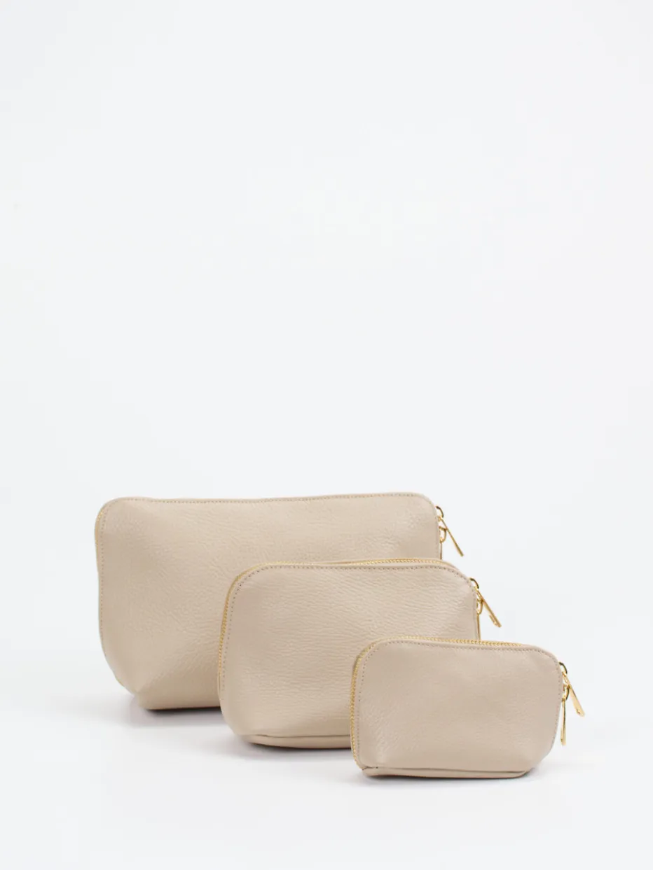 Reduziert auf das Wesentliche zeigt sich das 3er-Set von Marlon Firenze in genarbtem Kalbleder und zurückhaltendem Beige – ein stilvolles Accessoire für Ordnung mit Anspruch im Reisealltag.