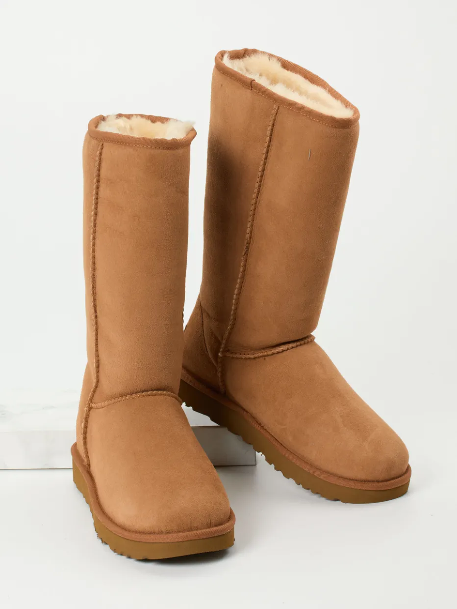 Ein hochwertiger Winter-Boot von UGG mit charakteristischer Cognacnuance, echtem Lammfellfutter und rutschfester Gummisohle – stilvoller Komfort trifft skandinavische Schlichtheit.
