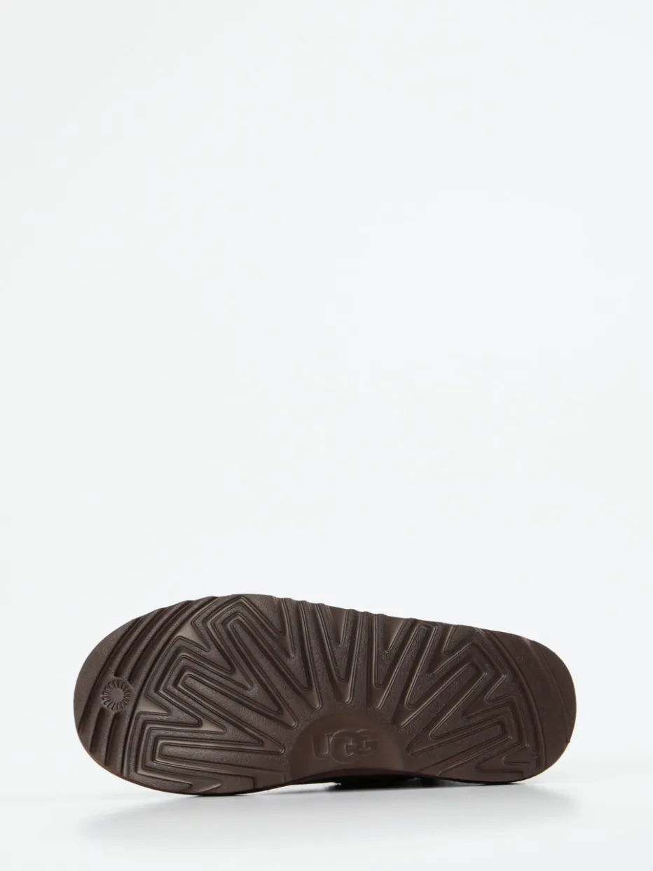 Wärme trifft auf Lässigkeit.UGG präsentiert eine hochwertige Unisex-Stiefelette aus der Kategorie Lammfell-Boots. Ideal für entspannte Tage daheim oder lockere Freizeit-Looks: Das schokobraune Veloursleder mit mattierter Oberfläche verleiht dem klassischen Modell seine edel-robuste Ausstrahlung. Das echte, weich wärmende Lammfellfutter sorgt für ein rundum behagliches Tragegefühl. Die knöchelhohe, rund geschnittene Silhouette mit Zuglasche erleichtert den Einstieg, während eine markant profilierte Sohle sicheren Halt auf winterlichen Böden gibt. Dezente Ton-in-Ton-Nähte und geprägte Logos an Ferse und Sohle unterstreichen den cleanen Look im Stil der „Quiet Luxury“-Ästhetik. Ein komfortorientierter Style, wie gemacht für kühle Tage mit Anspruch.