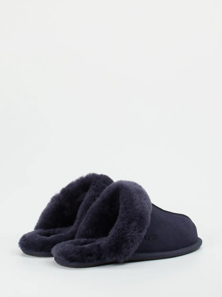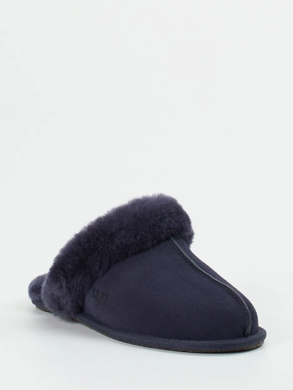 Das dunkelblaue Veloursleder mit matter Oberfläche ist weich angeschliffen und ergibt in Kombination mit dem warmen Lammfellfutter ein behagliches Tragegefühl – ideal für kühle Tage. Die offene Fersenpartie in Schlupfform, die Ton-in-Ton-Nähte und die geprägte Logo-Seite unterstreichen den dezenten Look. Der Gummikork-Mix an der Sohle macht dieses Modell sogar outdoor-tauglich. Inspiriert von Hygge und Shearling-Trends der Saison, passt es perfekt zu entspannten Loungewear-Styles oder Fleece-Outfits.