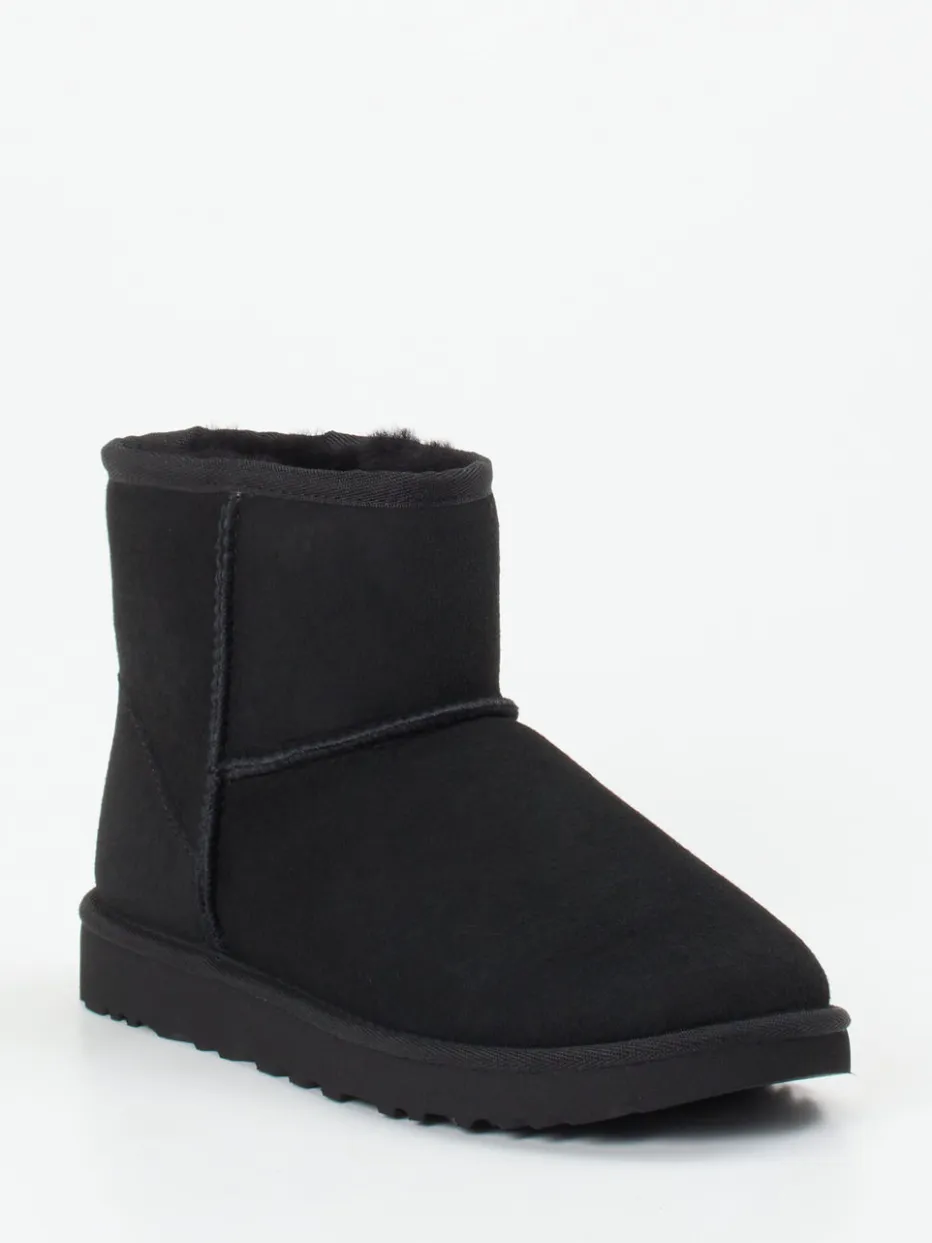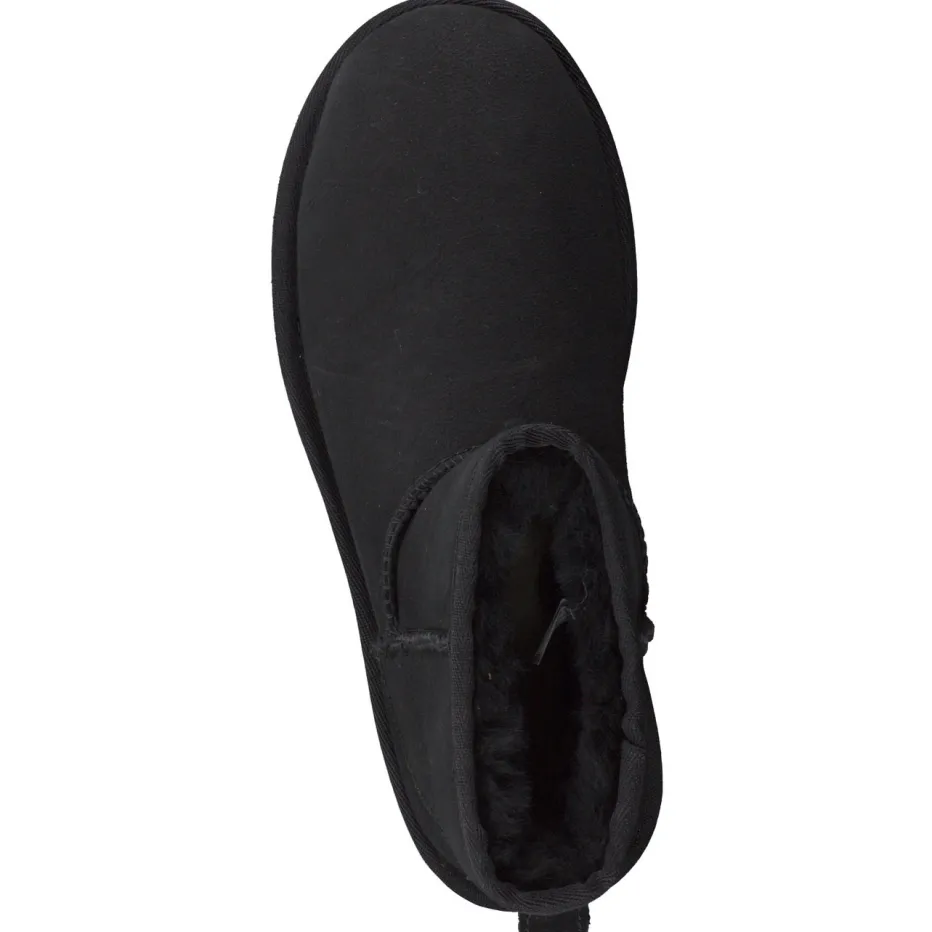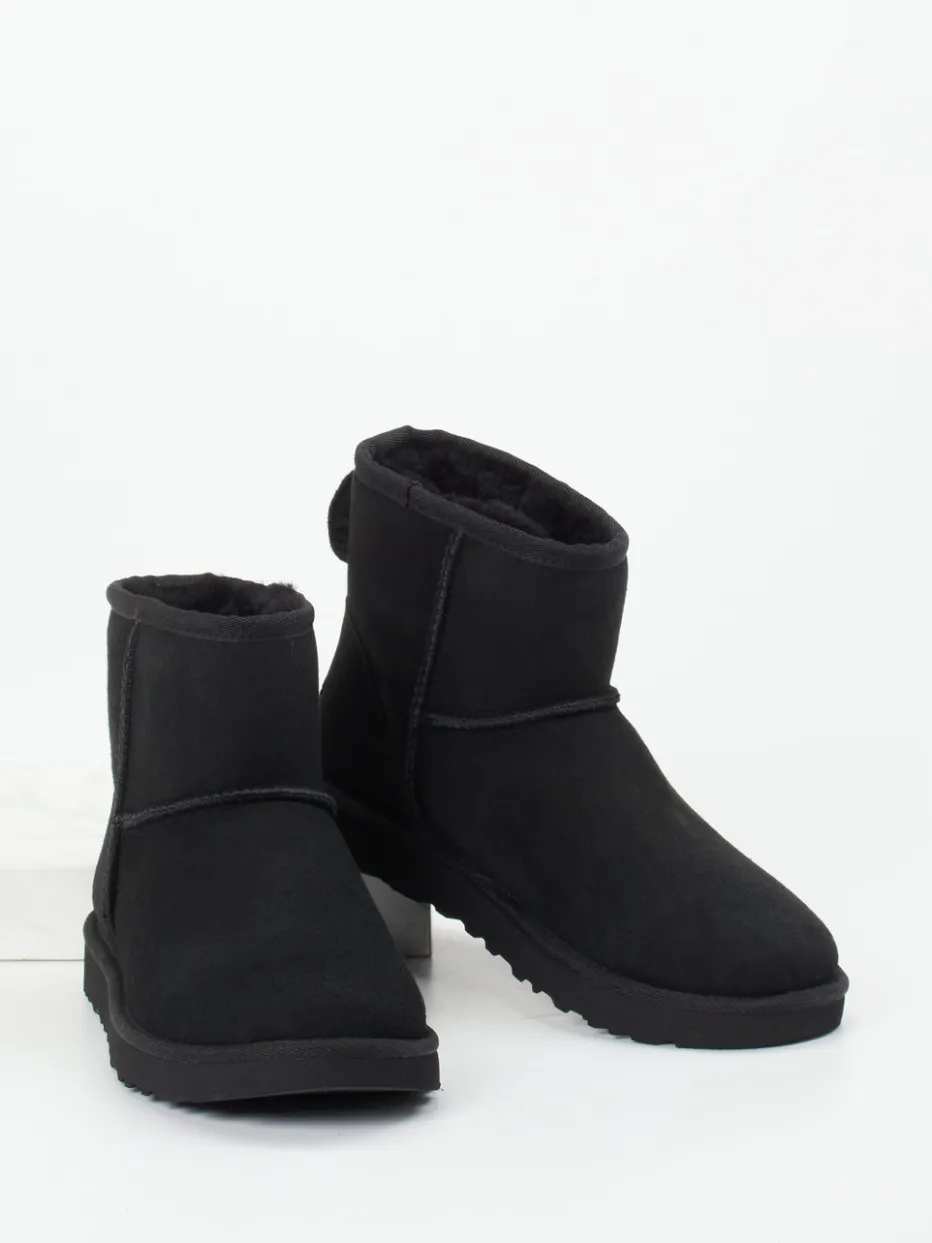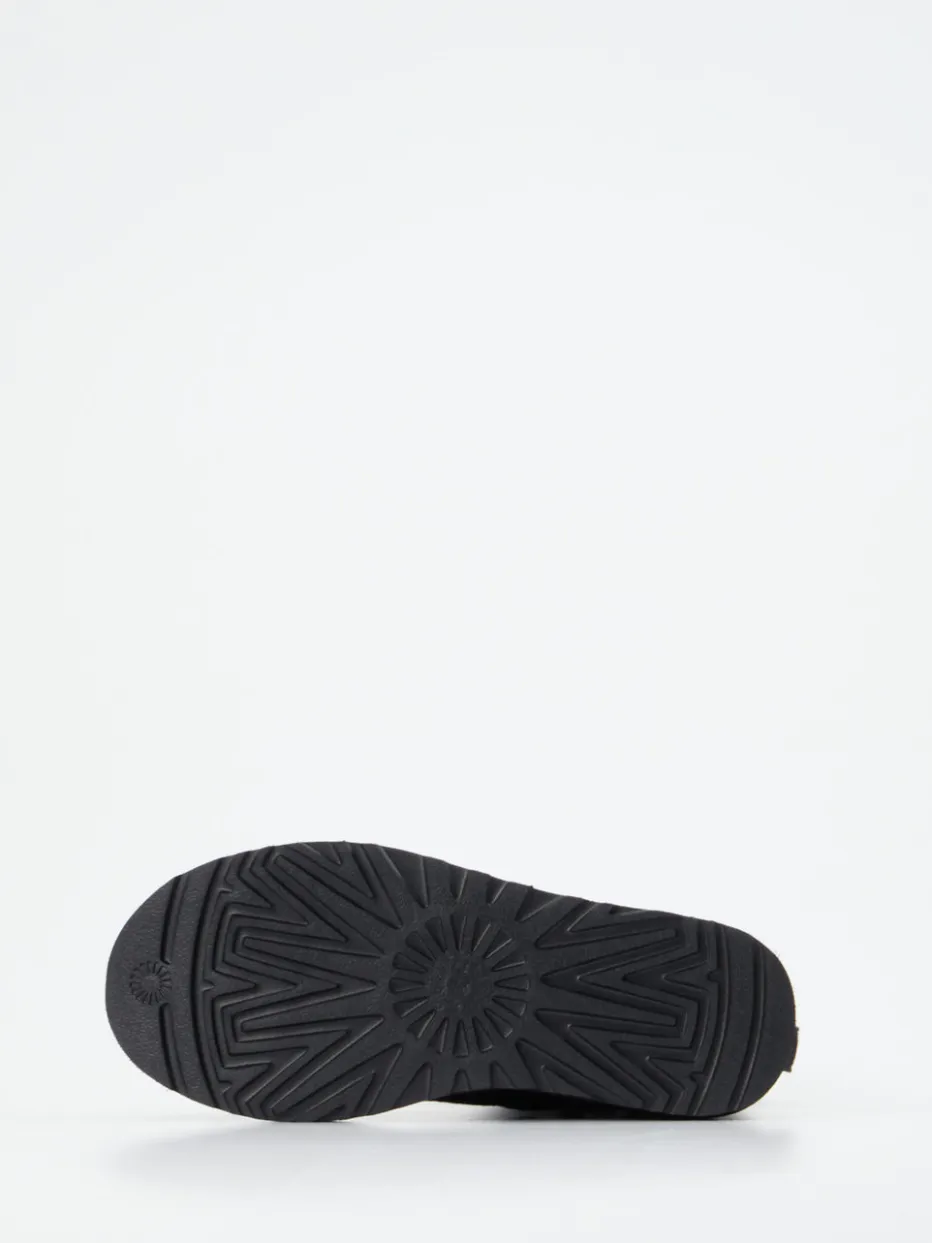 Winterklassiker mit Komfortfaktor.Die Marke UGG präsentiert hier eine Damen-Stiefelette für die kalte Jahreszeit. Dank weichem Veloursleder mit samtig-matter Oberfläche und kuscheligem Lammfellfutter bietet das Modell verlässliche Wärme an frostigen Tagen. In tiefem Schwarz gehalten, zeigt sich die knöchelhohe, klassisch gerundete Silhouette mit sauber gearbeiteten Ton-in-Ton-Nähten und einem Logo-Patch an der Ferse. Die bequeme Schlupfform mit Zuglasche erlaubt ein unkompliziertes Anziehen, während die profilierte Gummisohle für Trittsicherheit sorgt. Der minimalistische Look passt zur Cozy-Winterwear und ergänzt sowohl entspannte Home-Outfits als auch lässige Streetstyle-Kombis. Ein Wohlfühl-Boot mit typischer UGG-DNA und hohem Tragekomfort.