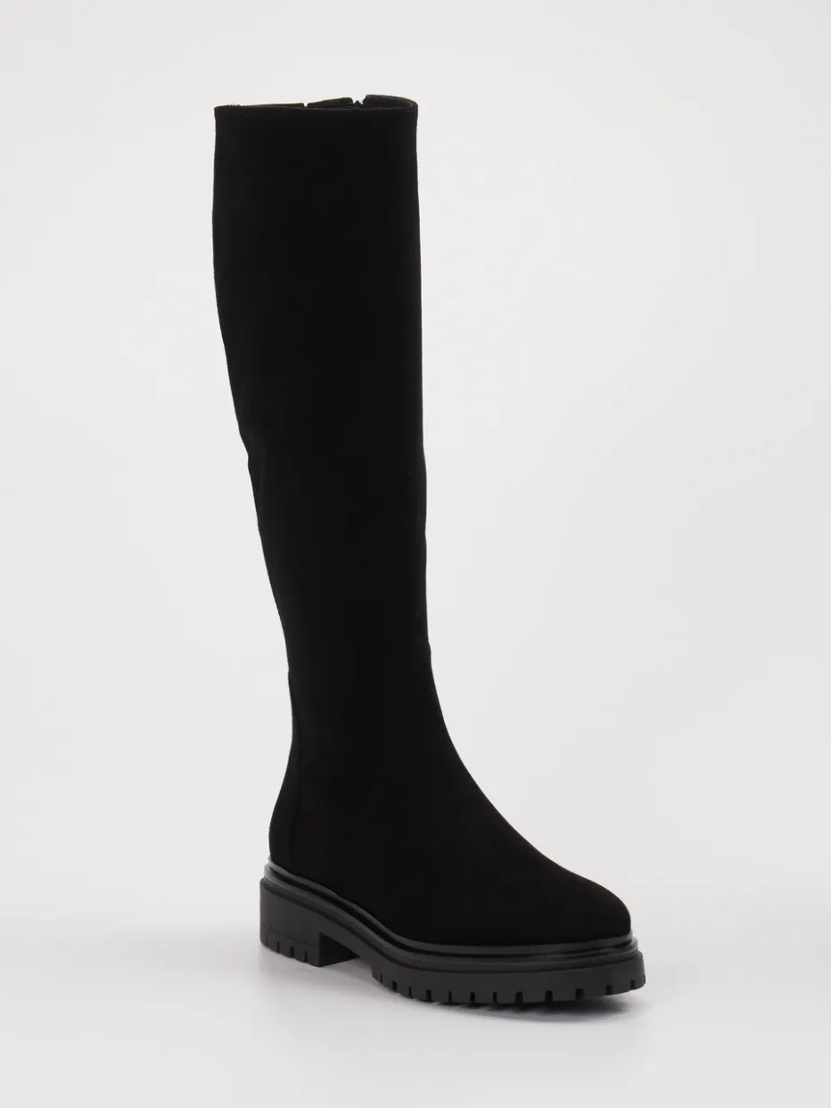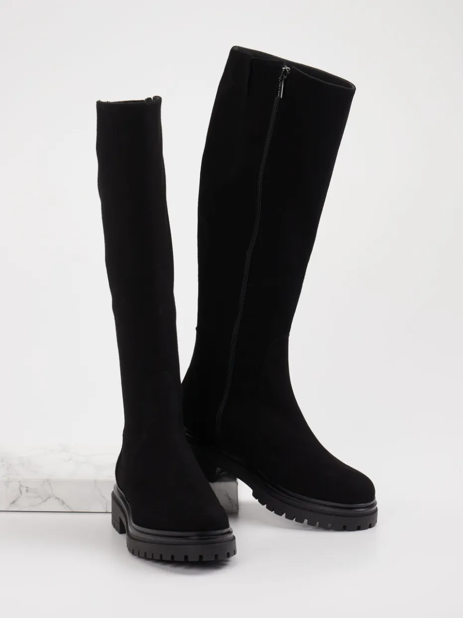 Klare Linien und matte Samthaptik prägen diesen femininen Langschaftstiefel mit robuster Profilsohle – perfekt für minimalistische Looks im urbanen Herbst-Winter.
