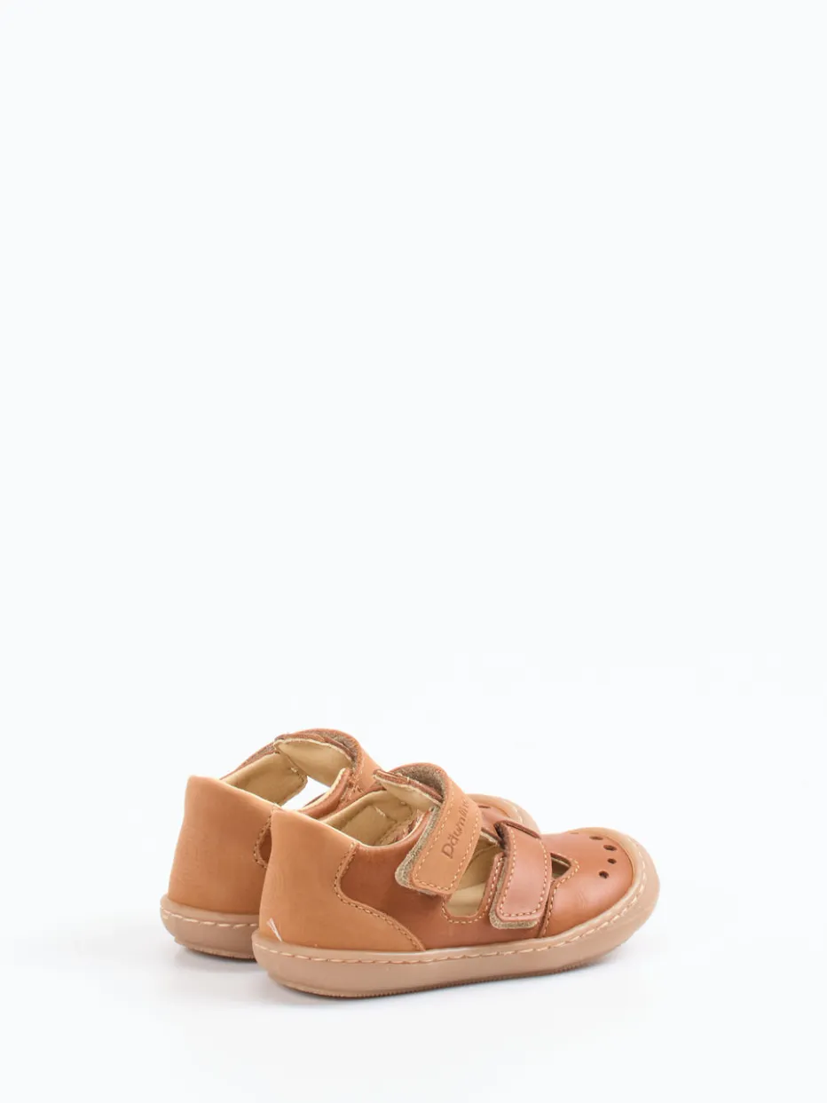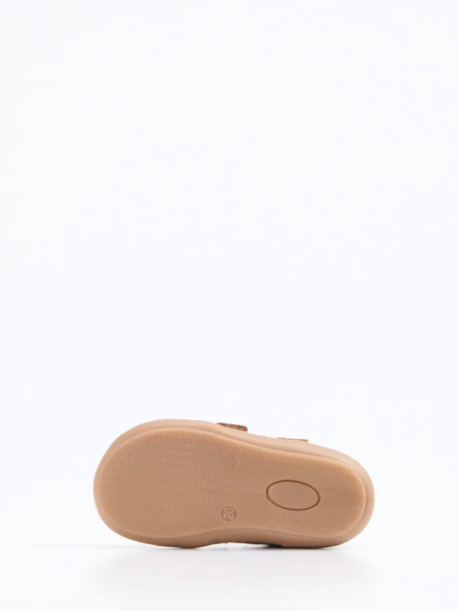 Ideal für Alltag und Freizeit: Die geschlossene Zehenpartie schützt kleine Füße zuverlässig, während die doppelt verstellbaren Klettverschlüsse für festen Halt sorgen. Das matte Naturleder in einem warmen Cognacbraun wird durch feine Kontrastnähte und ein geprägtes Markenlogo betont. Die ergonomisch geformte Gummisohle bietet rutschfesten Stand bei ersten Gehversuchen. Inspiriert vom skandinavischen Minimalismus fügt sich das Design nahtlos in die „Slow Fashion Kids“-Linie ein. Kombiniert mit Naturstrümpfen entsteht ein rundum harmonischer Look.