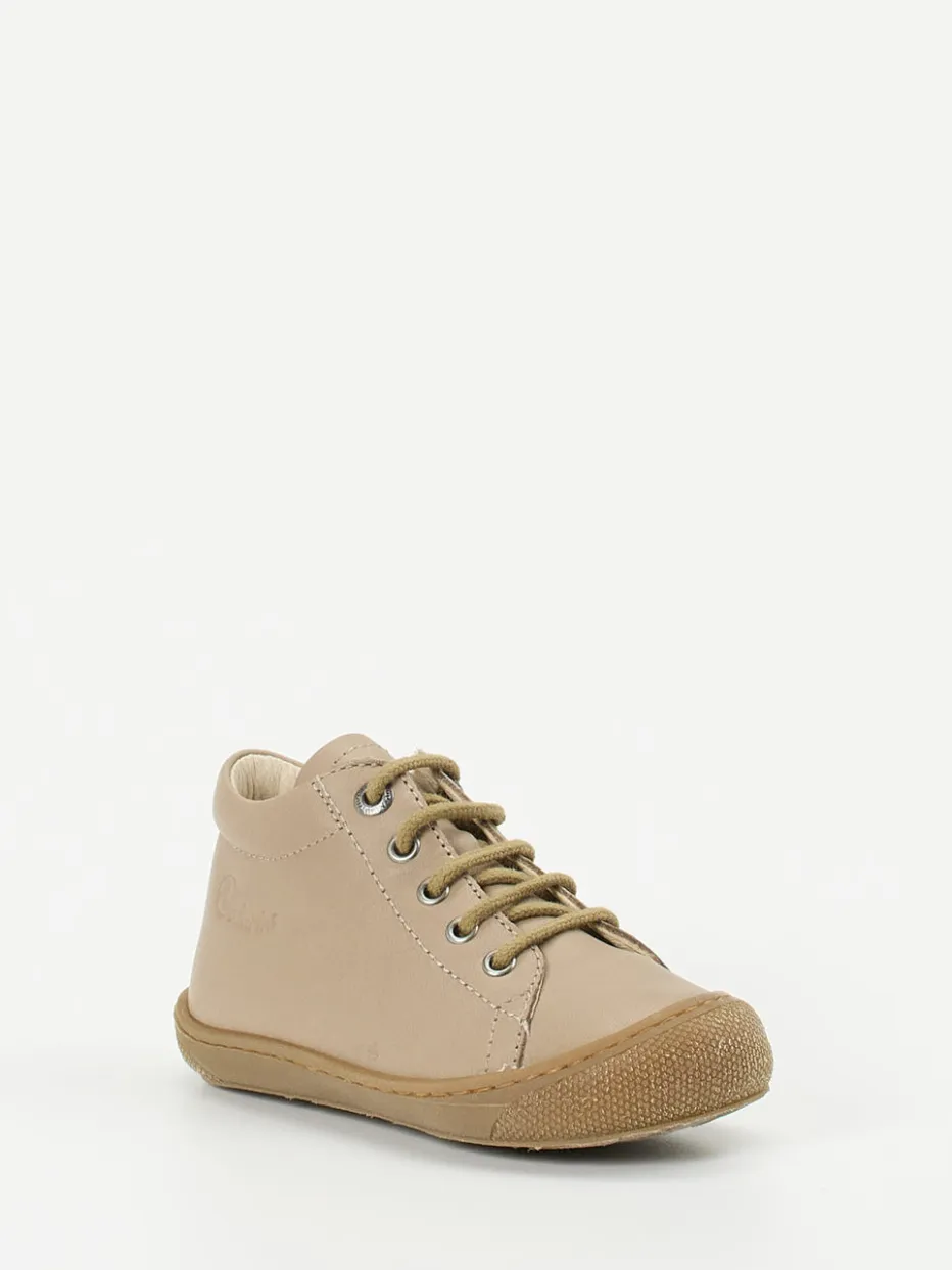 Ideal für erste Gehversuche: Das weiche Kalbleder bietet in Verbindung mit dem beigen Farbton und der matten Oberfläche eine dezente, hochwertige Optik. Die klassische, runde Form mit robuster Schnürung über Metallösen und einer verstärkten Zehenkappe sorgt für guten Sitz und Schutz. Innen überzeugt das Modell mit ledergefüttertem Komfort und einem weich gepolsterten, austauschbaren Fußbett. Die rutschhemmende honigfarbene Gummisohle ergänzt das funktionale Design. Ton-in-Ton-Nähte und ein geprägtes Seitenlogo runden den reduzierten Look ab.