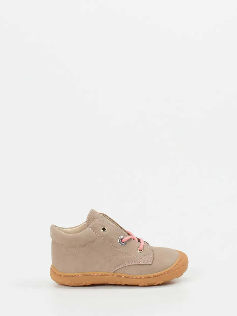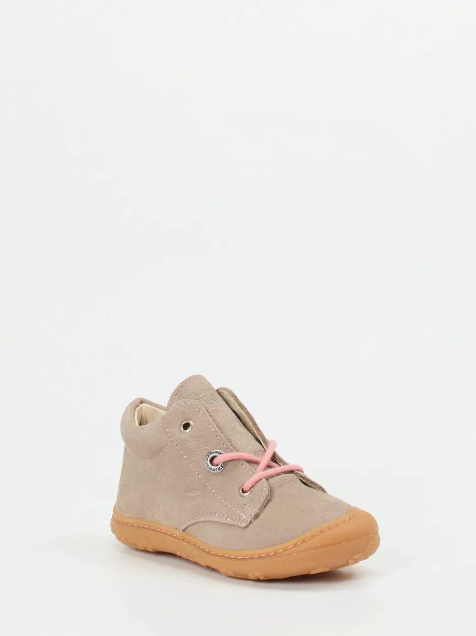 Stabiler Start in stilvollem Scandi-Look.Die Marke Ricosta präsentiert einen komfortablen Lauflernschuh für kleine Kinderfüße. Ob erste Schritte im Garten oder spielerischer Alltag zu Hause – dieser Schnürschuh aus feinem Nubukleder, samtig angeschliffen, bietet optimalen Halt. Das sandbeige Obermaterial wird von rosa Kontrastnähten und Schnürung lebendig akzentuiert. Der rund geschnittene, knöchelhohe Schaft, ein weich gepolsterter Einstieg und die biegsame Gummisohle mit Krabbelschutz unterstreichen die durchdachte Funktionalität. Inspiriert von skandinavischer Schlichtheit passt er hervorragend in die Soft-Neutrals-Trendlinie der Saison. Kombiniert mit Wollsocken entsteht ein stilvolles Alltagsoutfit für Babys. Ideal für erste Schritte mit Komfort und stilvoller Zurückhaltung.