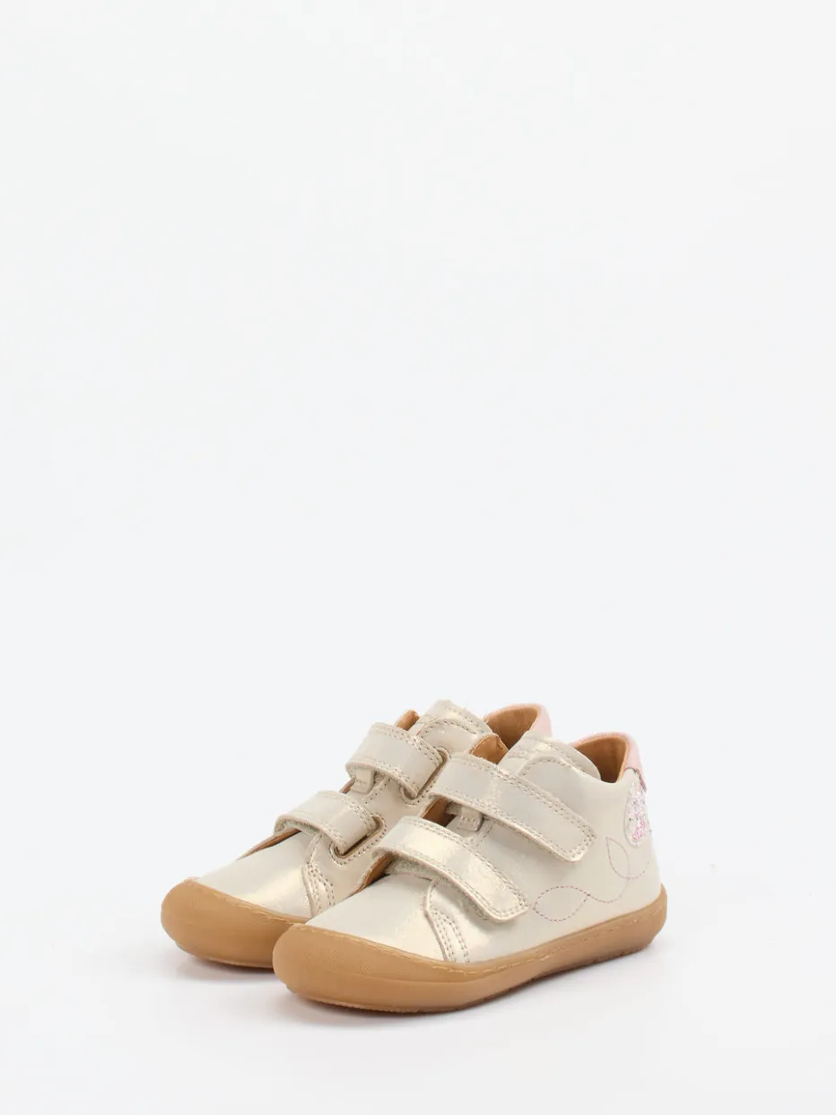 Für erste Schritte mit Glanz.Die Marke Froddo steht bei Lauflernschuhen für Qualität und liebevolles Design. Bei ersten Entdeckungstouren bieten diese Schuhe sicheren Halt und hohen Tragekomfort. Das champagnerfarbene Metallicleder schimmert dezent und fühlt sich angenehm geschmeidig an. Glitzernde Schleifen-Applikationen, ein rosa Ferseneinsatz und eine dekorative Ziernaht setzen verspielte Akzente. Die Gummisohle ist flexibel sowie rutschfest und unterstützt kindgerechtes Bewegen. Dank des Doppelklettverschlusses gelingt das An- und Ausziehen mühelos – praktisch im Alltag. Das Design greift aktuelle Pastell- und Glitzertrends für Kids auf und passt perfekt zu soften Tönen. Sanfte Materialien und verspielte Details – Froddo verbindet Stil mit Komfort.