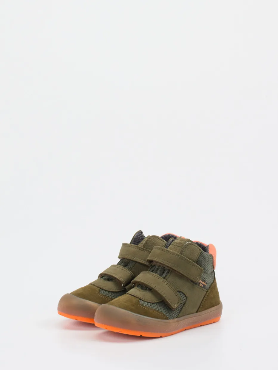 Bereit für jedes Abenteuer.Die Marke Froddo präsentiert mit diesen Lauflernschuhen ein outdoor-inspiriertes Kindermodell im High-Top-Design. Ideal für vielseitige Alltagseinsätze: Das weiche Nubukleder wird durch strukturierte Textileinsätze ergänzt und sorgt gemeinsam mit dem gepolsterten Fersenbereich für angenehmen Halt. Farblich setzen der Olivgrün-Grundton, die korallenfarbene Fersenkappe und orange Akzente auffällige Kontraste. Klettverschlüsse bieten eine einfache Handhabung, während die griffige Gummisohle Trittsicherheit gibt. Das Design zitiert aktuelle Color-Blocking- und Gorpcore-Trends. Froddo kombiniert stilbewussten Look mit durchdachter Kindgerechtigkeit.