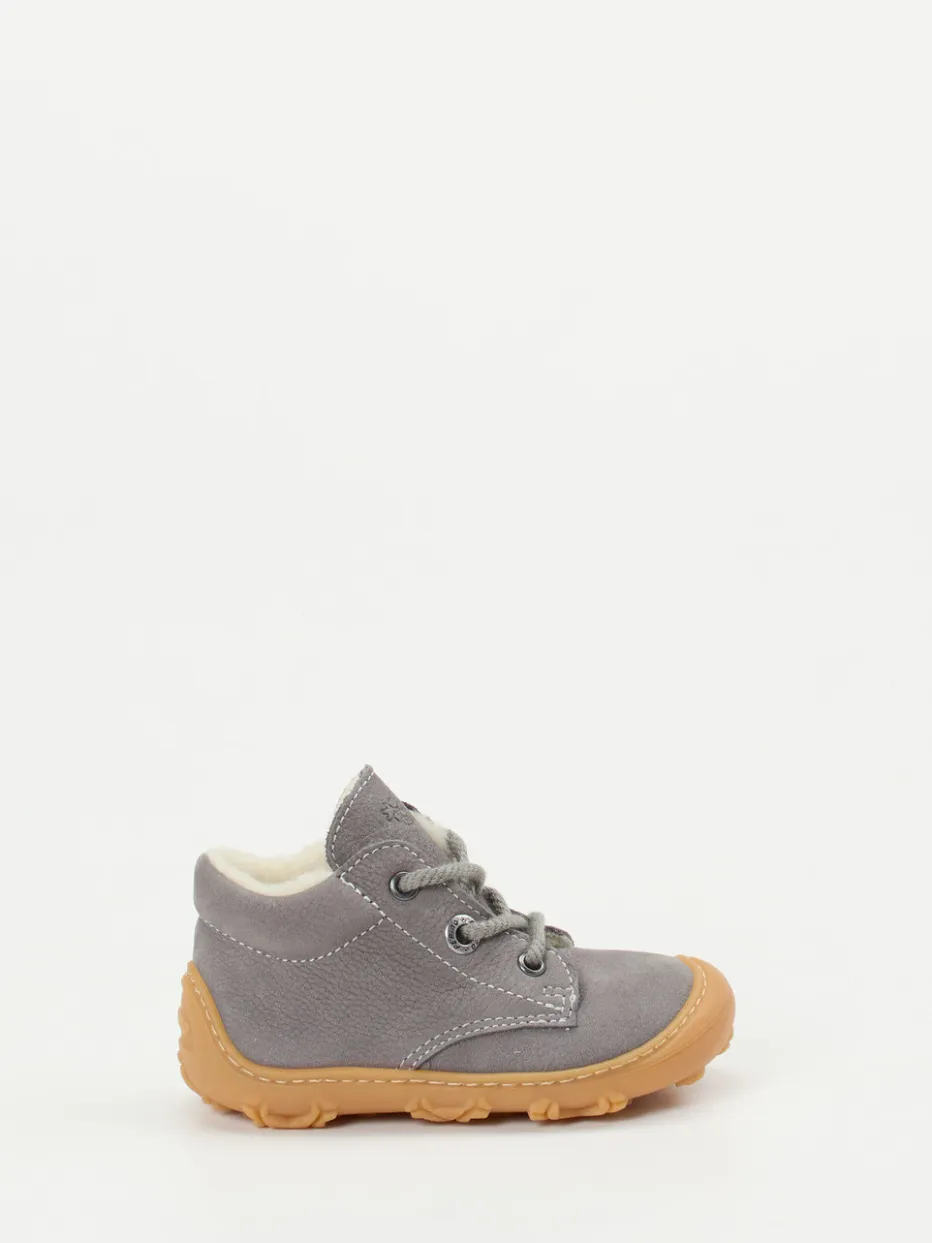 Sanft starten, sicher gehen.Ricosta präsentiert mit diesen Lauflernschuhen ein durchdachtes Modell für kleine Entdecker. Ideal für erste Schritte an kühlen Herbsttagen bieten die grauen Schuhe aus Nubukleder mit genarbter Oberfläche hohen Tragekomfort. Die kompakte, runde Form mit verstärkter Zehenkappe und toniger Schnürung sorgt für sicheren Halt beim Laufenlernen. Das warme Textilfutter in Lammwolloptik schützt zuverlässig vor Kälte, während die flexible Gummisohle mit rutschfestem Profil Bewegungsfreiheit ermöglicht – inspiriert vom Outdoor-Stil, im Geist des „Quiet Luxury“-Trends. Dezente Kontrastnähte und zurückhaltendes Design runden das Modell ab. Ein Lauflernschuh mit Funktionalität, Komfort und qualitativer Handwerkskunst von Ricosta.