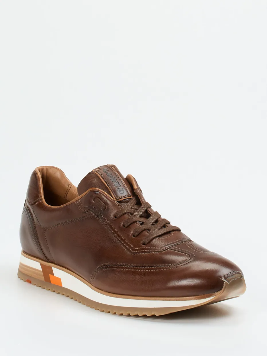 Retro trifft auf Handwerkskunst.Lloyd präsentiert mit diesem Herren-Sneaker ein stilvoll interpretiertes Freizeitmodell. Die Kombination aus changierendem, leicht glänzendem Kalbleder und klassisch flacher Silhouette erfüllt gehobene Ansprüche im Alltag oder im Business-Casual-Kontext. Farbige Akzente in Orange und Beige an der strukturierten Gummisohle unterstreichen den Retro-Vibe und harmonieren mit dem mittelbraunen Obermaterial. Handwerkliche Nähte setzen zusätzliche Design-Statements. Die herausnehmbare, lederbezogene Einlegesohle sorgt für individuellen Tragekomfort. Ein urbaner Ledersneaker mit leiser Extravaganz und klarer Linienführung – stilistisch souverän von Lloyd.