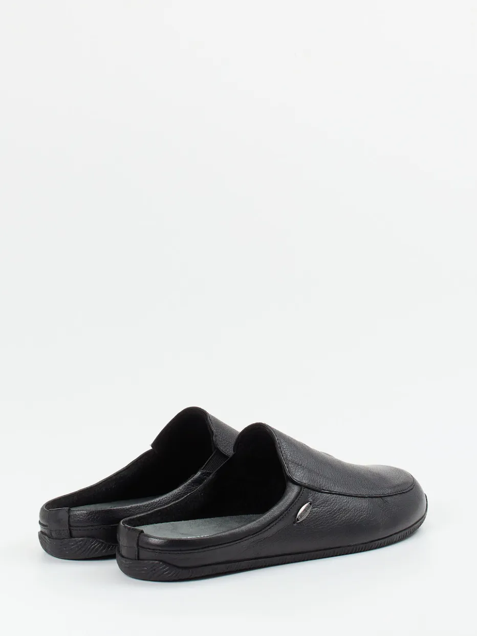 Perfekt für entspannte Momente zu Hause.Giesswein präsentiert einen hochwertigen Herren-Hausschuh in bequemer Schlupfform. Die handwerklich verarbeiteten Pantoffeln aus schwarzem Kalbleder zeigen sich in genarbter Optik mit Ton-in-Ton-Nähten und Metall-Logo. Die gepolsterte Innensohle und das weiche Textilfutter unterstreichen den Komfortanspruch. Mit der rutschhemmenden Gummisohle und der offenen Fersenpartie empfiehlt sich das Modell für entspannte Loungewear-Styles. Schlicht und zugleich stilvoll – passend zum Trend Quiet Luxury. Ein Hausschuh für kompromisslose Bequemlichkeit im eleganten Design von Giesswein.