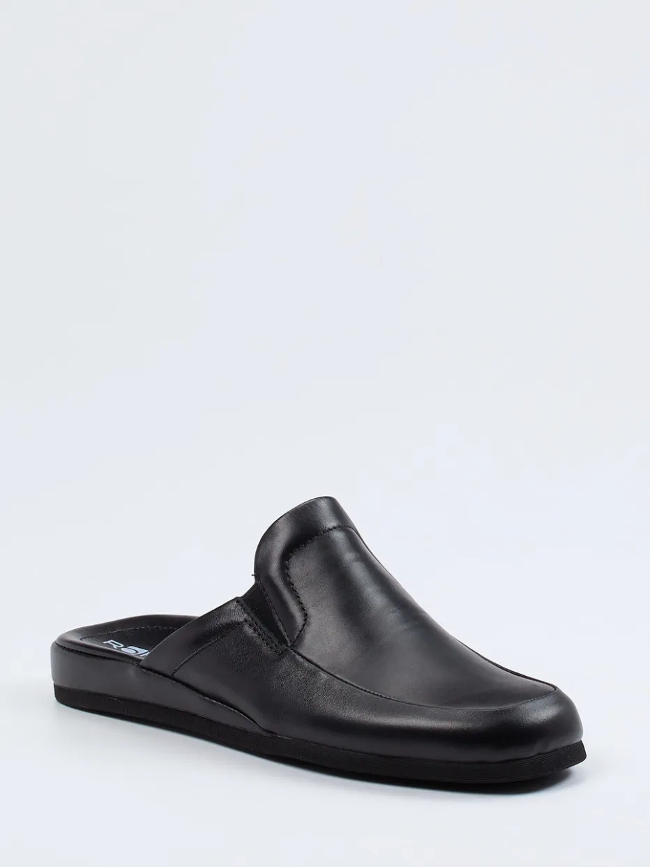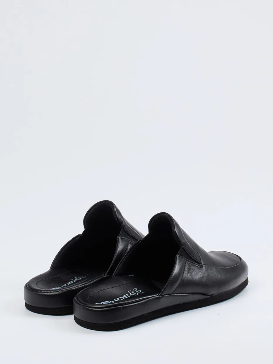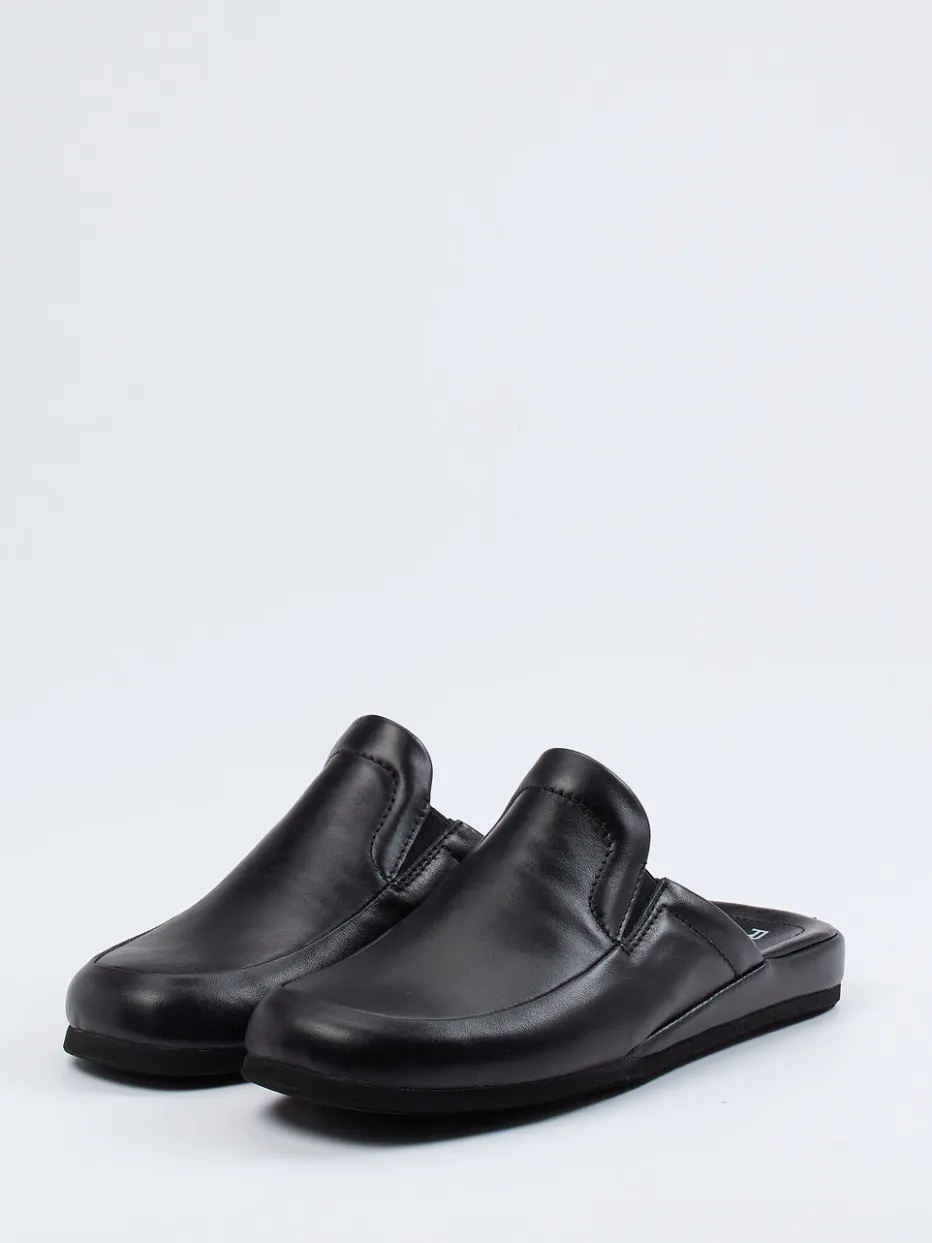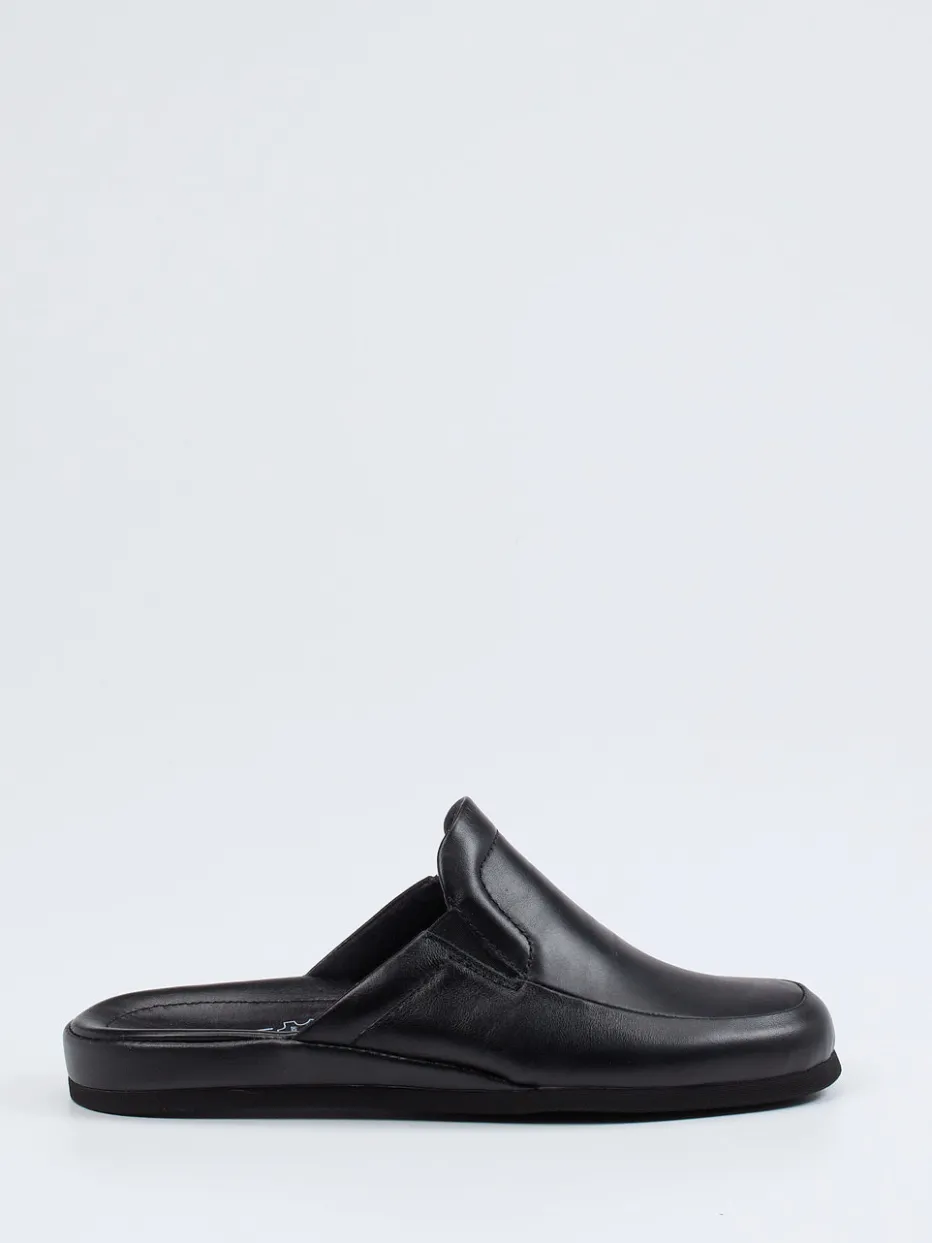 Ob nach Feierabend oder während eines gemütlichen Wochenendes – dieses Modell erfüllt höchste Komfortansprüche. Gefertigt aus hochwertigem, matt schwarzem Kalbleder mit glatter Oberfläche und Ton-in-Ton-Nähten, vereint die Pantolette klassisches Design und moderne Funktion. Die geschlossene Front, offen gearbeitete Ferse und elastische Seiteneinsätze sorgen für Komfort beim Hineinschlüpfen. Die gepolsterte Innensohle mit ergonomischer Form und die flexible, rutschhemmende Gummisohle unterstreichen den Wohnkomfort. Im Stil von „Quiet Luxury“ passt sie ideal zu feinem Loungewear oder klassischen Hausanzügen.