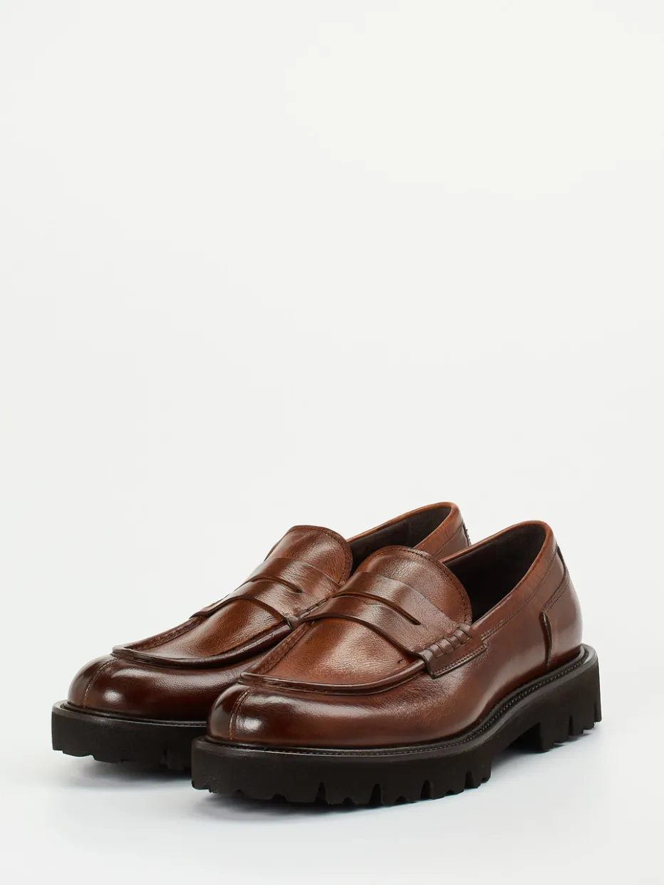 Dieser Herren-Loafer setzt auf cognacfarben glänzendes Büffelleder und kombiniert klassische Eleganz mit aktuellem Chunky-Profil für festen Tritt und stilvolle Vielseitigkeit.