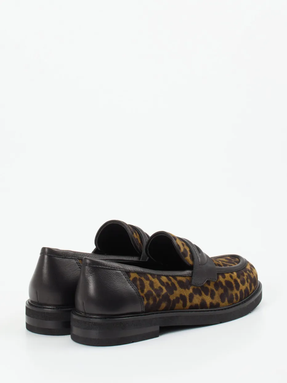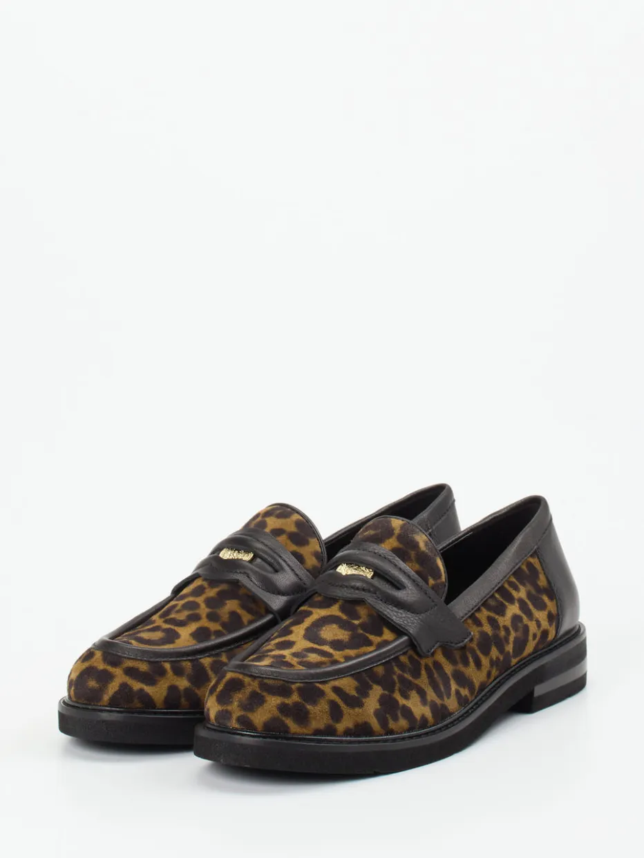 Starkes Statement in Leopardenoptik.Maripé präsentiert mit diesem Damen-Loafer ein modisches Highlight mit Extravaganz. Ob im Büro oder beim Ausgehen – der Loafer erfüllt den Wunsch nach einem auffälligen, dabei komfortablen Schuhbegleiter. Das feine Fell zeigt einen ausdrucksstarken Leoprint und wird durch schwarzen Glatt- und Velourslederbesatz spannungsvoll kontrastiert. Goldfarbene Spange mit Münzdetail, klassisch-lowcut Silhouette und profilierte Gummisohle unterstreichen den hochwertigen Eindruck. Inspiriert von Vintage-Elementen und Animal Print-Trends der Saison. Lässt sich stilecht mit Zigarettenhose oder Crossbody Bag kombinieren. Hochwertiges Kalblederfutter und weich gepolstertes Fußbett sorgen für Alltagstauglichkeit mit Stil.