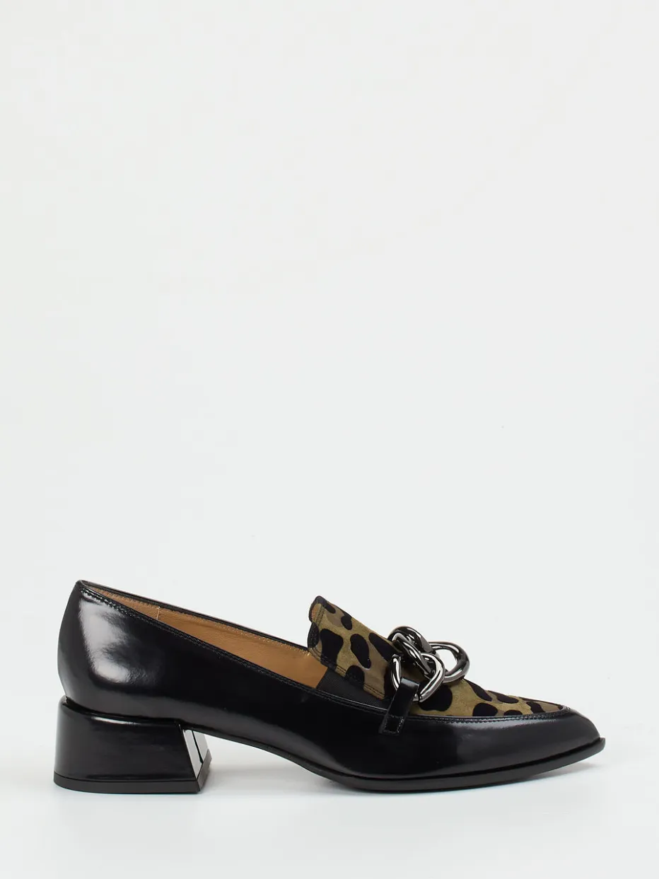 Eleganz für Business und Alltag.Andrea Puccini präsentiert mit diesem Damen-Loafer eine elegante Interpretation eines modernen Klassikers. Ideal für urbane Looks mit Anspruch überzeugt das Modell durch geprägtes Glattleder mit samtigen Velours-Einsätzen im olivfarbenen Animalprint. Die spitz zulaufende Form unterstreicht den femininen Charakter, während die schwarze Metallkette mit glänzender Oberfläche als designstarkes Element wirkt. Die rutschfeste Gummisohle mit 3 cm hohem Blockabsatz sorgt für sicheren Auftritt. Modisch eingebettet im Trend um Quiet Luxury, lässt sich dieser Slipper stilvoll zu Blazern oder Culottes kombinieren. Ein Statement-Schuh mit subtilem Luxus und italienischer Formensprache.