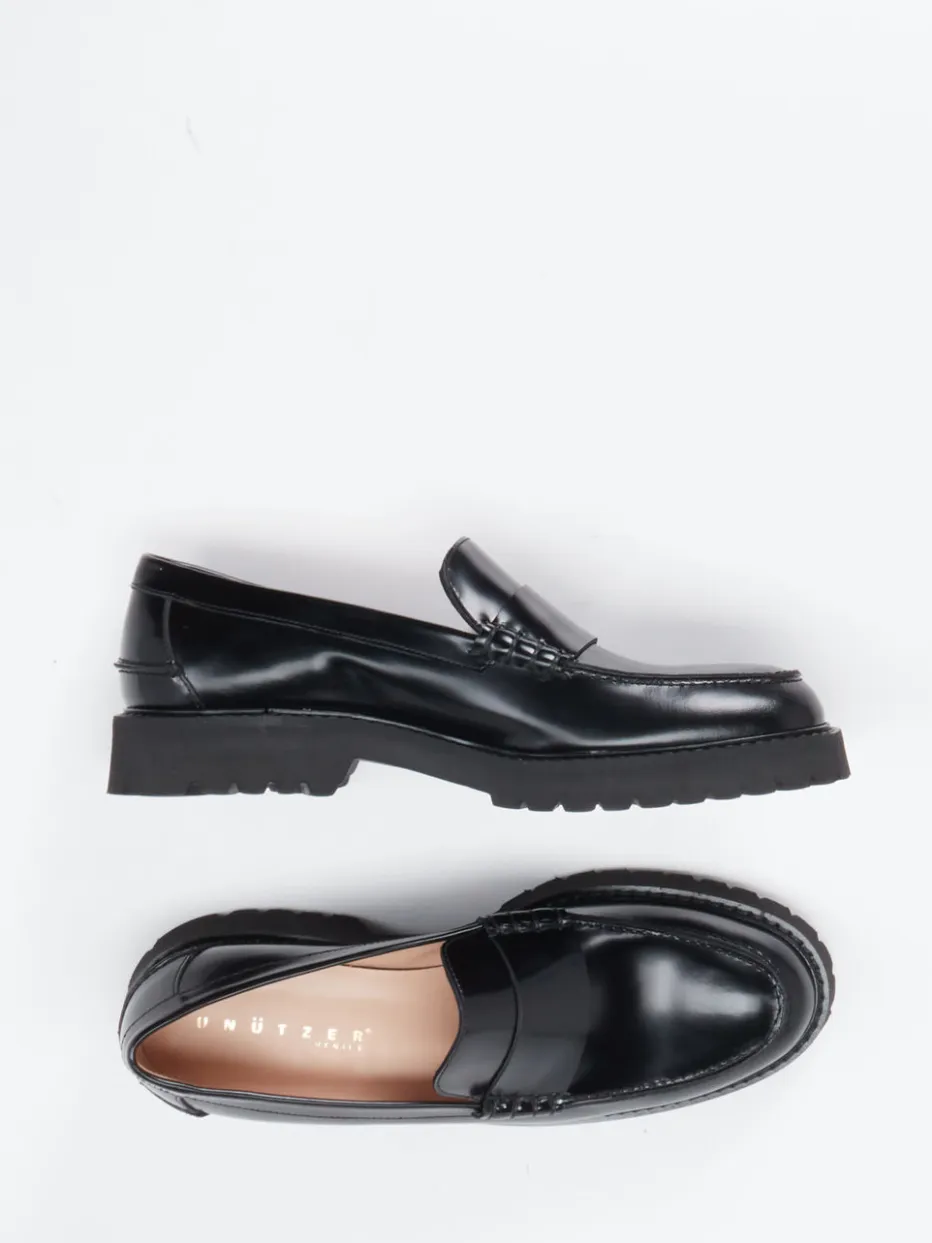 Puristisches Design trifft auf edle Verarbeitung: Dieser schwarze Loafer von Unützer kombiniert glänzendes Kalbleder mit markanter Profilsohle für stilvolle Auftritte.