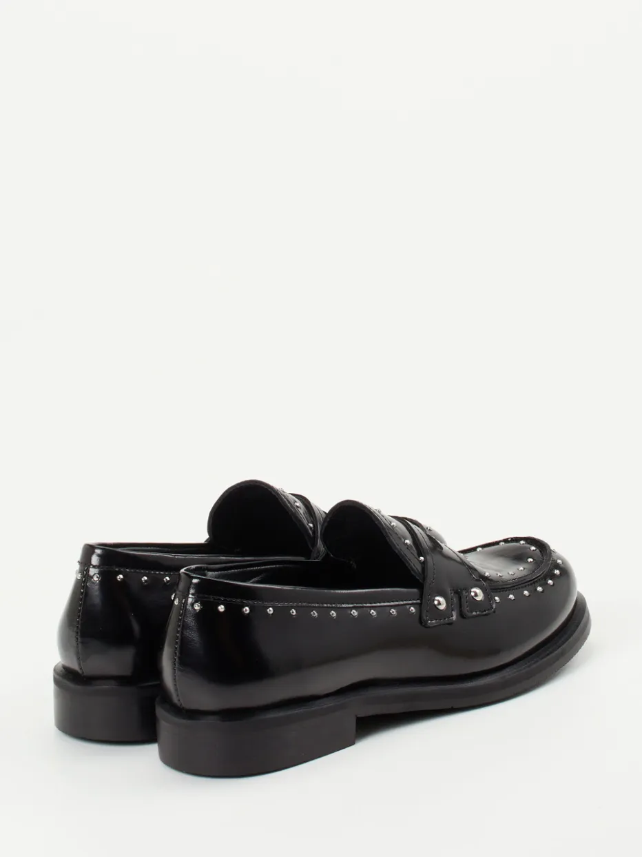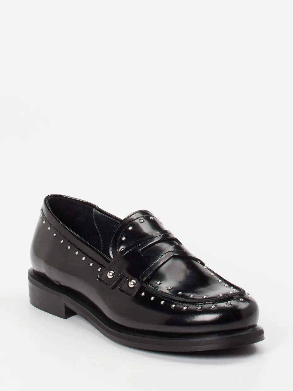 Dieser Loafer von Maripé vereint edles Hochglanzleder mit rockigen Details wie silberfarbenen Nieten – ein stilbewusster Akzent zwischen Klassik und Punk.