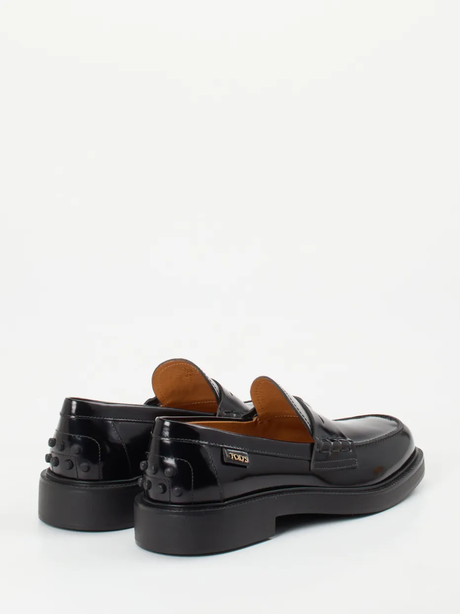 Klassischer Chic mit Glanzfaktor.Dieser Damen-Loafer von Tod’s verbindet edlen Minimalismus mit ikonischem Preppy-Flair. Ob für Meetings oder Freizeit – das schwarze Hochglanzleder wirkt durch seine glatte, glänzende Oberfläche besonders präsent und hochwertig. Klassisch geformt mit Mokassinnaht, geschlitzter Zunge und einem goldfarbenen Markenemblem, ergänzt die gummierte Noppensohle Komfort mit dezentem Retro-Akzent. Dank weichem Kalblederfutter eignet sich der Slipper auch für lange Tage. Perfekt zu schmalen Hosen, Anzuglooks oder Strickkleider-Kombinationen. Ein Ausdruck diskreter Raffinesse im Sinne zeitloser Markenqualität.