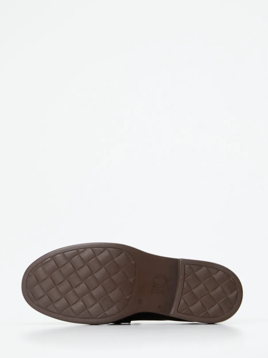 Schlichte Eleganz für kultivierte Looks.Pons Quintana präsentiert mit diesem Damenloafer ein Modell, das klassischen Charme und moderne Akzente vereint. Für stilbewusste Auftritte im Büro oder in der Freizeit bietet dieses Modell aus hochwertigem Kalbleder mit glänzender Patina und dunklen Farbverläufen die ideale Grundlage. Die schlanke Silhouette, kombiniert mit einer auffällig goldfarbenen Horsebit-Schnalle auf dem Blatt, verweist auf den aktuellen Heritage- und Preppy-Trend. Der Verzicht auf Verschlüsse unterstreicht das reduzierte Design, während die rutschhemmende Gummisohle mit dezenter Absatzhöhe alltagstauglichen Komfort ermöglicht. Besonders in Kombination mit Wollstoffen oder Feinstrick entsteht ein authentisch klassischer Look. Pons Quintana steht hier für detailverliebten Minimalismus mit luxuriösem Anspruch.