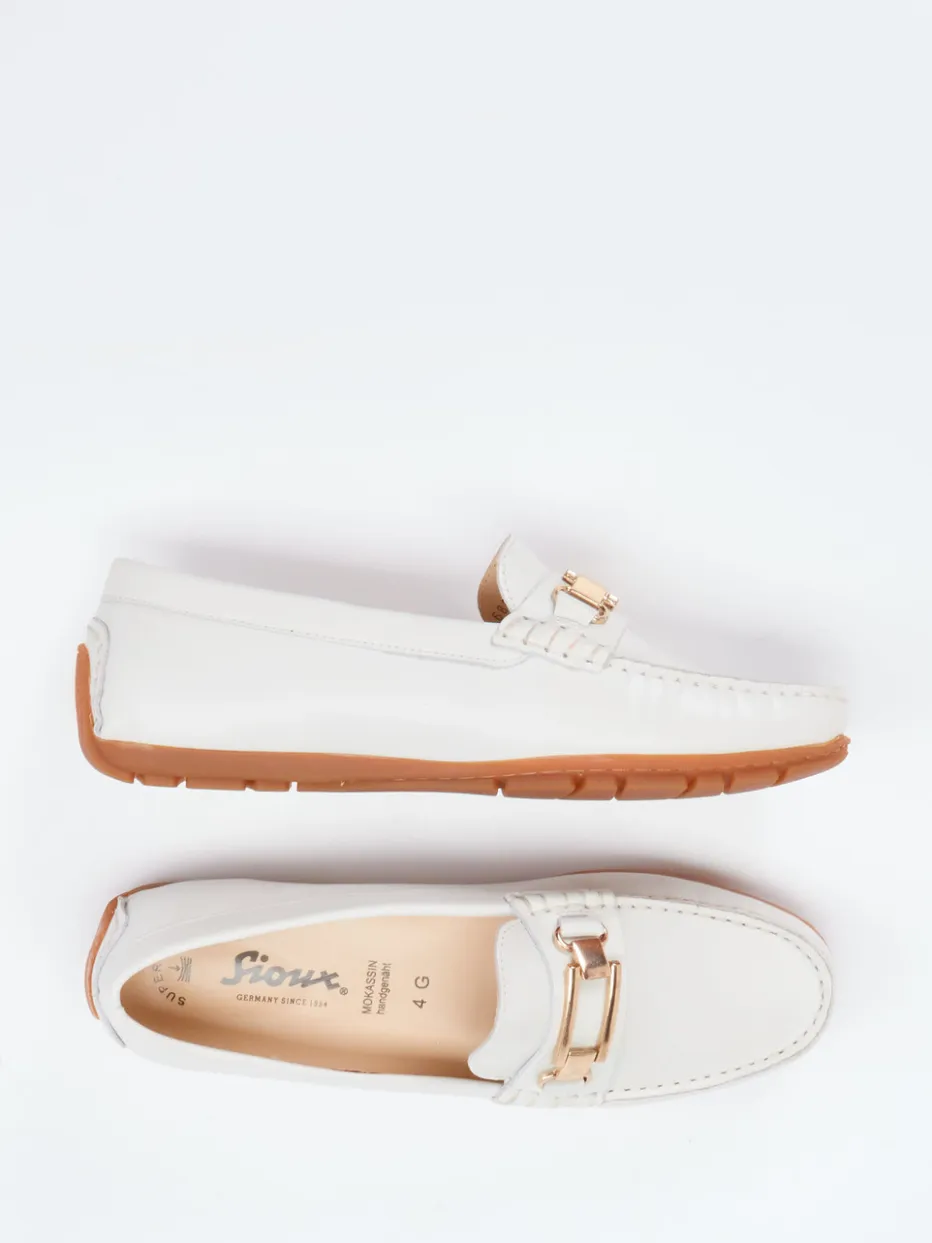 Feiner Minimalismus für Büro und Freizeit.Der Damen-Loafer von Sioux vereint Eleganz und Komfort in einem vielseitigen Halbschuhmodell. Ideal für lange Arbeitstage oder stilvolle Wochenendlooks: Das cremeweiße Kalbleder überzeugt durch seine glatte Oberfläche und wird durch die goldfarbene Spange sowie eine cognacfarbene Gummisohle mit Flexkerben akzentuiert. Handwerkliche Details wie die klassische Mokassin-Naht unterstreichen den anspruchsvollen Stil, während das gepolsterte Wechselfußbett und die Weite G für hohen Tragekomfort sorgen. Der Schlupfschuh wirkt durch seine flache Silhouette dezent und liegt ganz im Trend der Soft Neutrals der Saison. Ein souveräner Alltagsbegleiter mit klarer Formsprache und anspruchsvoller Qualität.