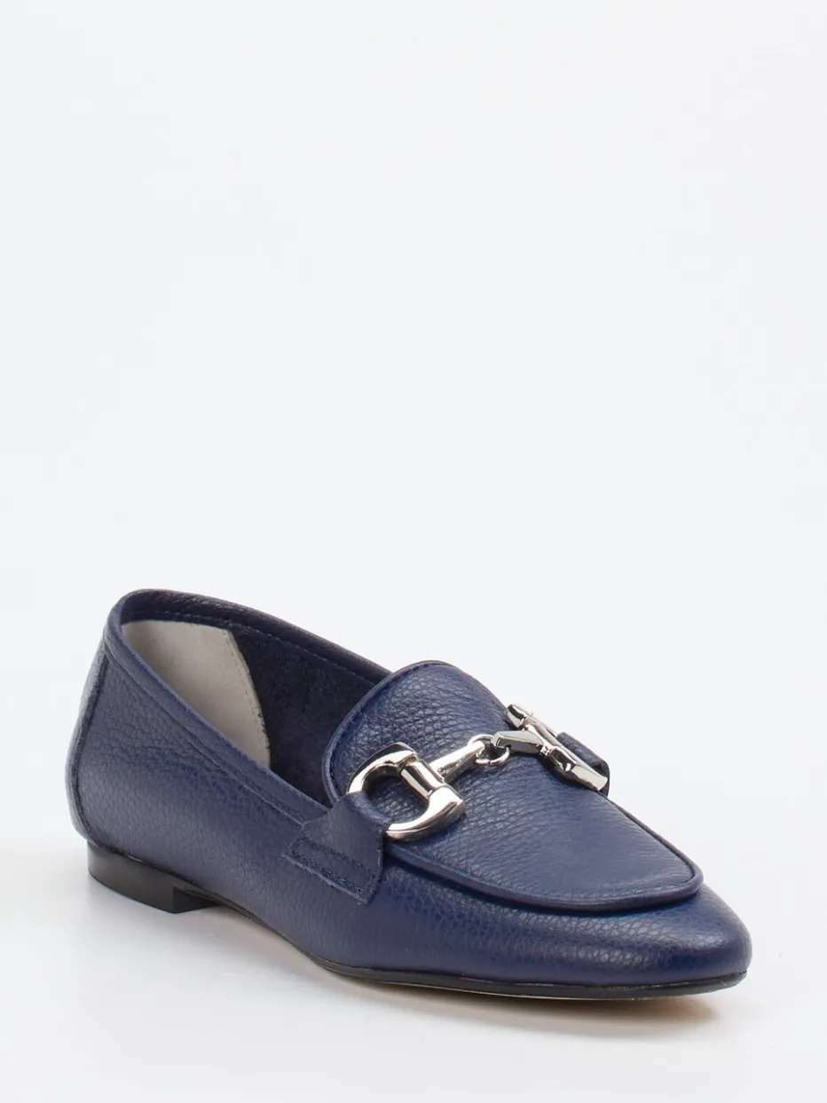 Preppy-Look mit Understatement.Die Marke Andrea Puccini zeigt mit diesem Damen-Loafer einen hochwertigen Slipper für Business und Alltag. Fein genarbtes Kalbleder in tiefem Marineblau bietet eine elegante Grundlage für das klassische Design. Die silberfarbene Horsebit-Spange auf dem Spann erinnert an ikonische Reitdetails und verleiht dem Look formale Note. Dank der schwarzen Gummisohle mit leichtem Absatz bleibt der Tragekomfort auch im dynamischen Alltag erhalten. Trendthemen wie Nachhaltigkeit im Stil und Heritage Classics spiegeln sich in der klaren Silhouette wider – perfekt für klassische oder minimalistische Garderoben. Harmoniert ideal mit Blazer und Lederhandtasche in gedeckten Tönen. Andrea Puccini steht für klassische Linien und feminine Stilqualität.