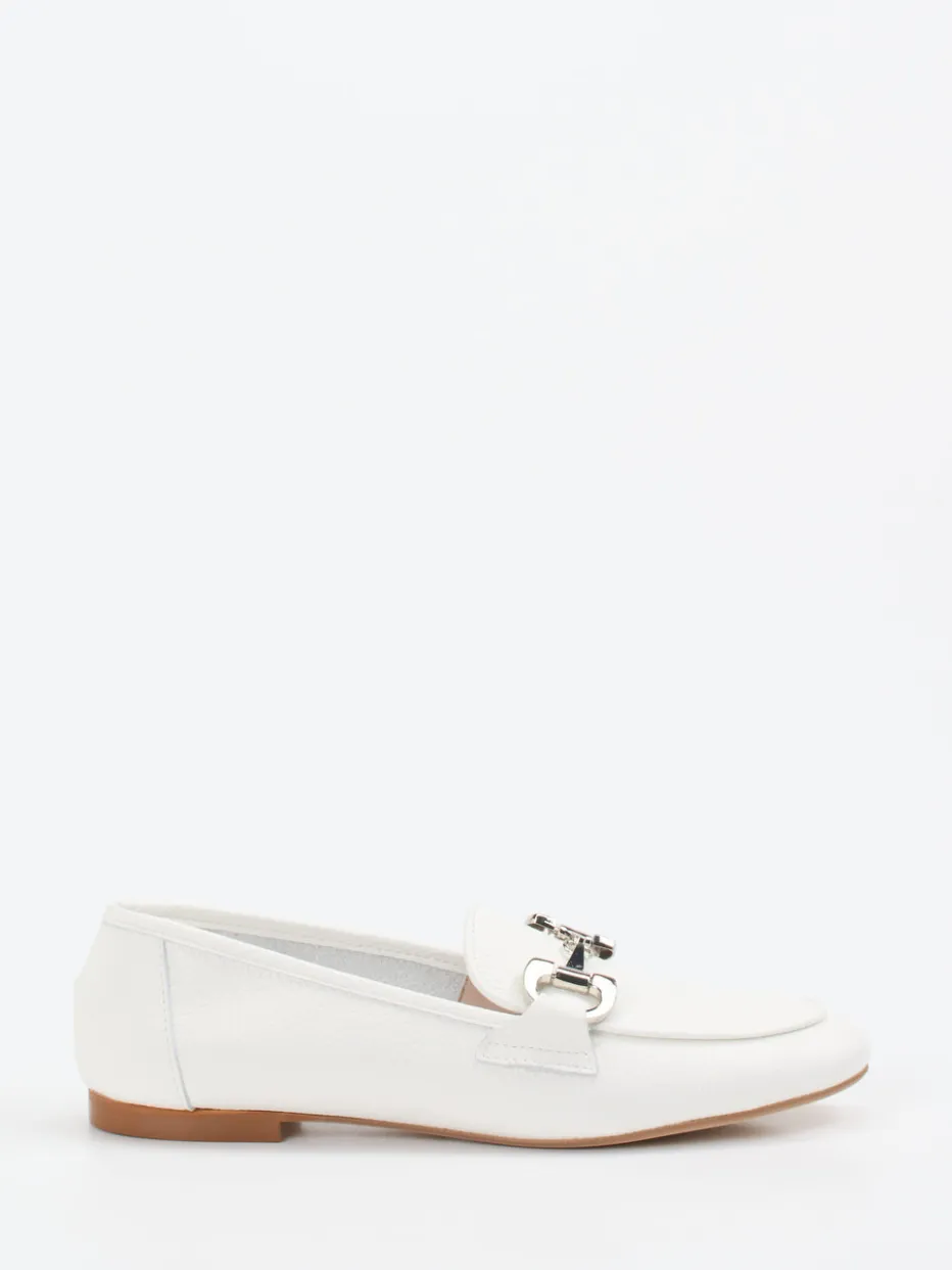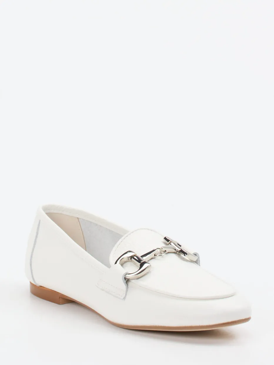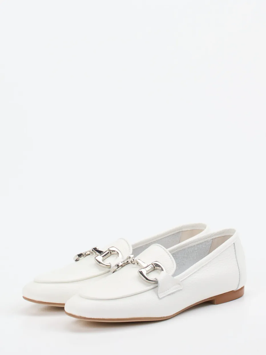 Fein genarbtes Kalbleder in Offwhite trifft auf klassische Eleganz. Die silberne Horsebit-Spange verleiht dem Loafer eine edle Note im Stil des Quiet Luxury.