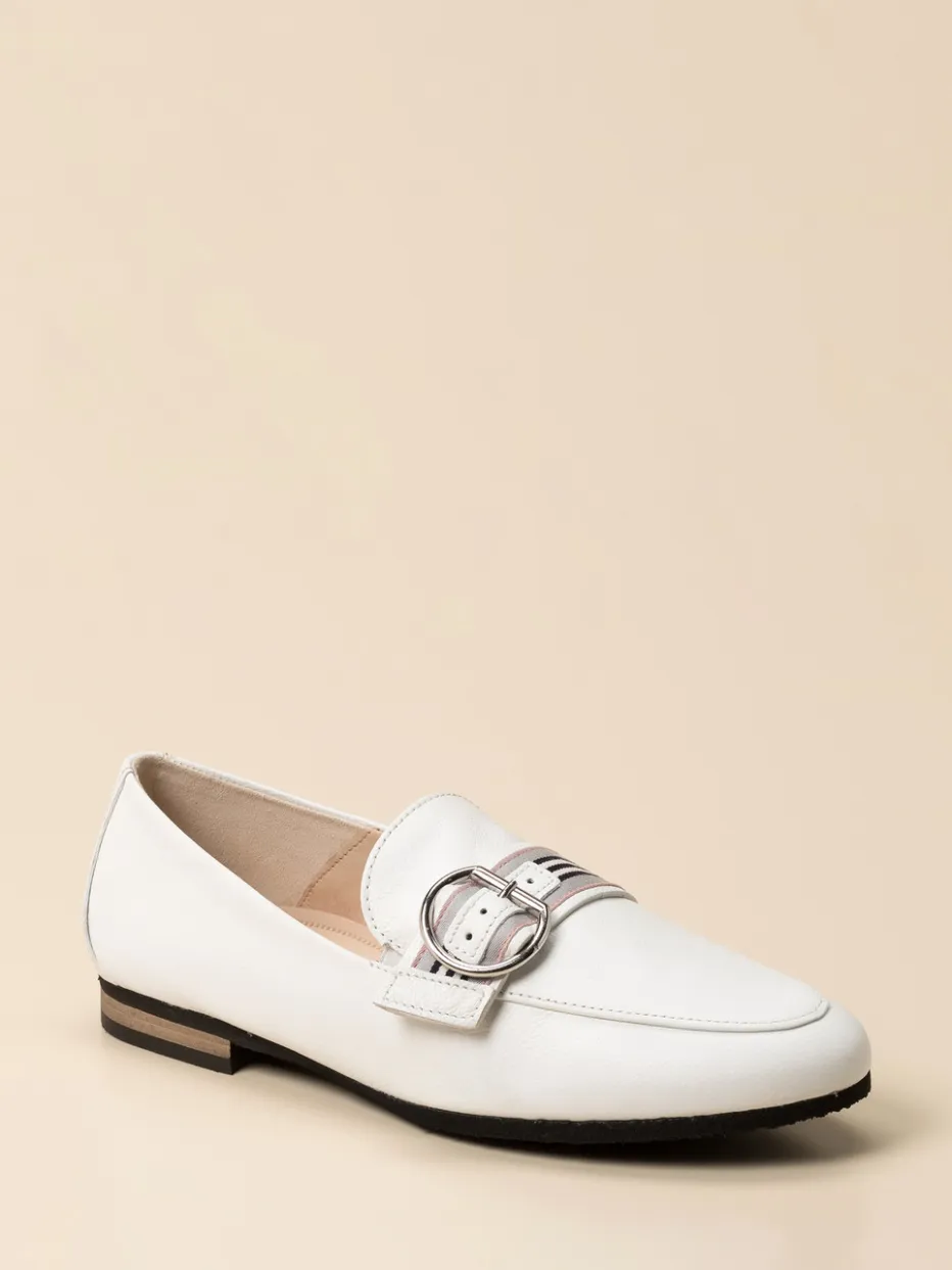 Strukturierter Komfort zeigt sich in diesem weißem Kalbleder-Loafer mit fein gearbeiteter Textilbride. Ideal für gepflegte Auftritte mit modischem Understatement.
