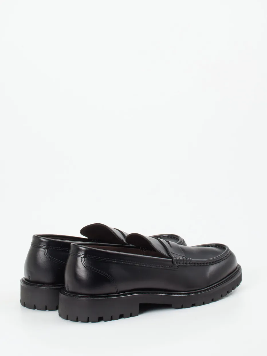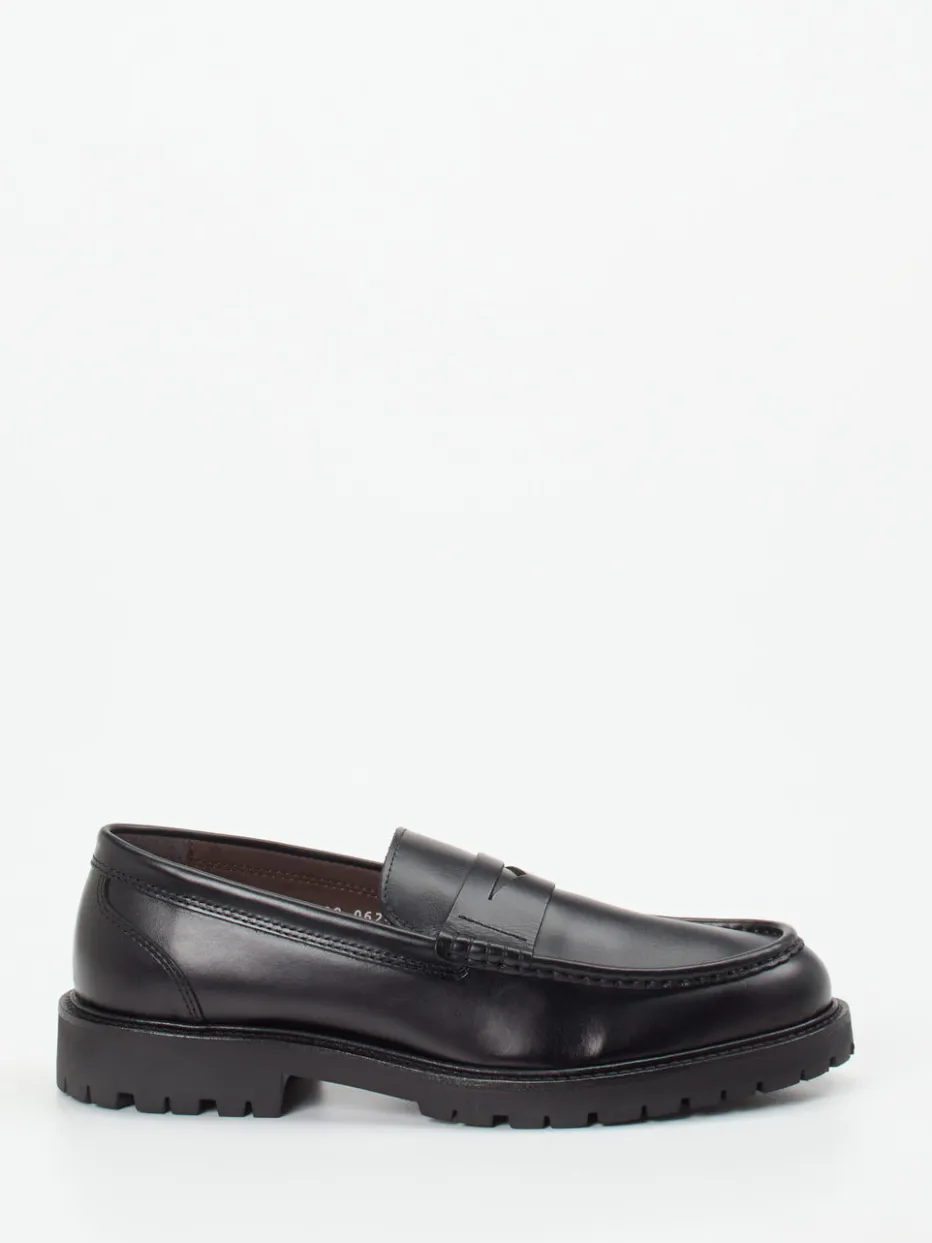 Zeitlose Silhouette trifft auf eine markant profilierte Sohle – dieser Loafer vereint klassische Formgebung mit modernen Akzenten in Schwarz.