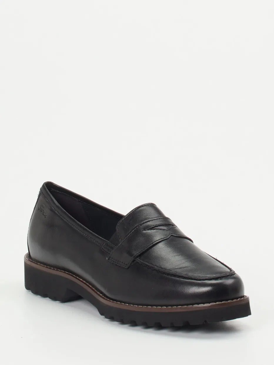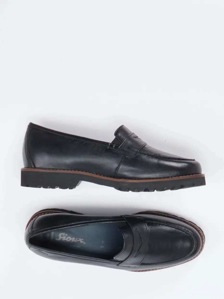 Komfort trifft auf charakterstarkes Design.Der Damen-Loafer von Sioux überzeugt als bequemer Trotteur mit traditionsbewusster Form und moderner Detailgestaltung. Für Büro und Alltag gleichermaßen geeignet, präsentiert sich dieser Loafer aus feinem, mattem Kalbleder in ausdrucksvollem Schwarz. Die flache Carré-Form kombiniert mit Mokassin-Ziernaht und dunkelbrauner Kontrastsohle verleiht dem klassischen Modell einen stilvollen Update im Zeichen von „Quiet Luxury“. Die leichte Profilsohle sorgt für festen Tritt, während die weich gepolsterte Innenausstattung und das herausnehmbare Fußbett hohen Tragekomfort garantieren. Ideal zu geradlinigen Hosen oder femininen Ensembles. Typisch Sioux: Handwerkliche Qualität mit modernem Anspruch an Komfort und Stil.