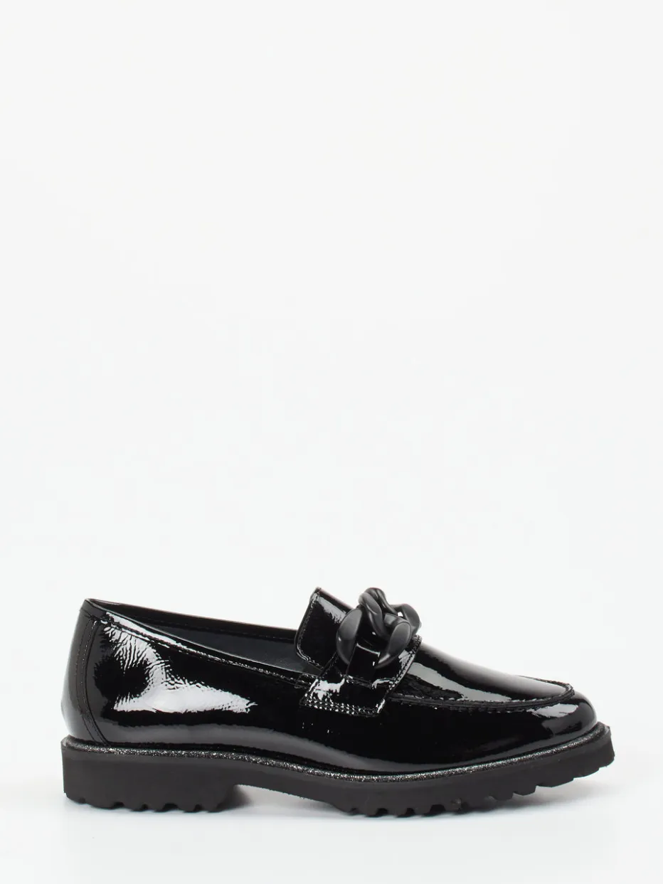 Statement in Lack und Profil.Die Marke Sioux präsentiert mit diesem Loafer ein Modell, das Moderne und Klassik vereint. Ob im Büro oder urban unterwegs – der Damen-Loafer aus schwarzem Lackleder überzeugt mit glänzender Oberfläche und elegantem Schlupfschnitt. Die tonal abgestimmte Kunststoffkette und sichtbare Mokassinnähte ergänzen die klassische Silhouette mit dezentem Statement-Charakter. Die Gummisohle mit profilierter Struktur bietet rutschhemmende Eigenschaften, das Innenfutter aus Leder-/Textil-Mix sowie das gepolsterte Wechselfußbett sorgen für spürbaren Komfort. Im Stil zwischen „Quiet Luxury“ und Streetwear schafft dieses Modell die Verbindung von Trendbewusstsein und Funktion. Ein komfortabler Blickfang mit Premium-Charakter – speziell für stilvolle Alltagsmomente.