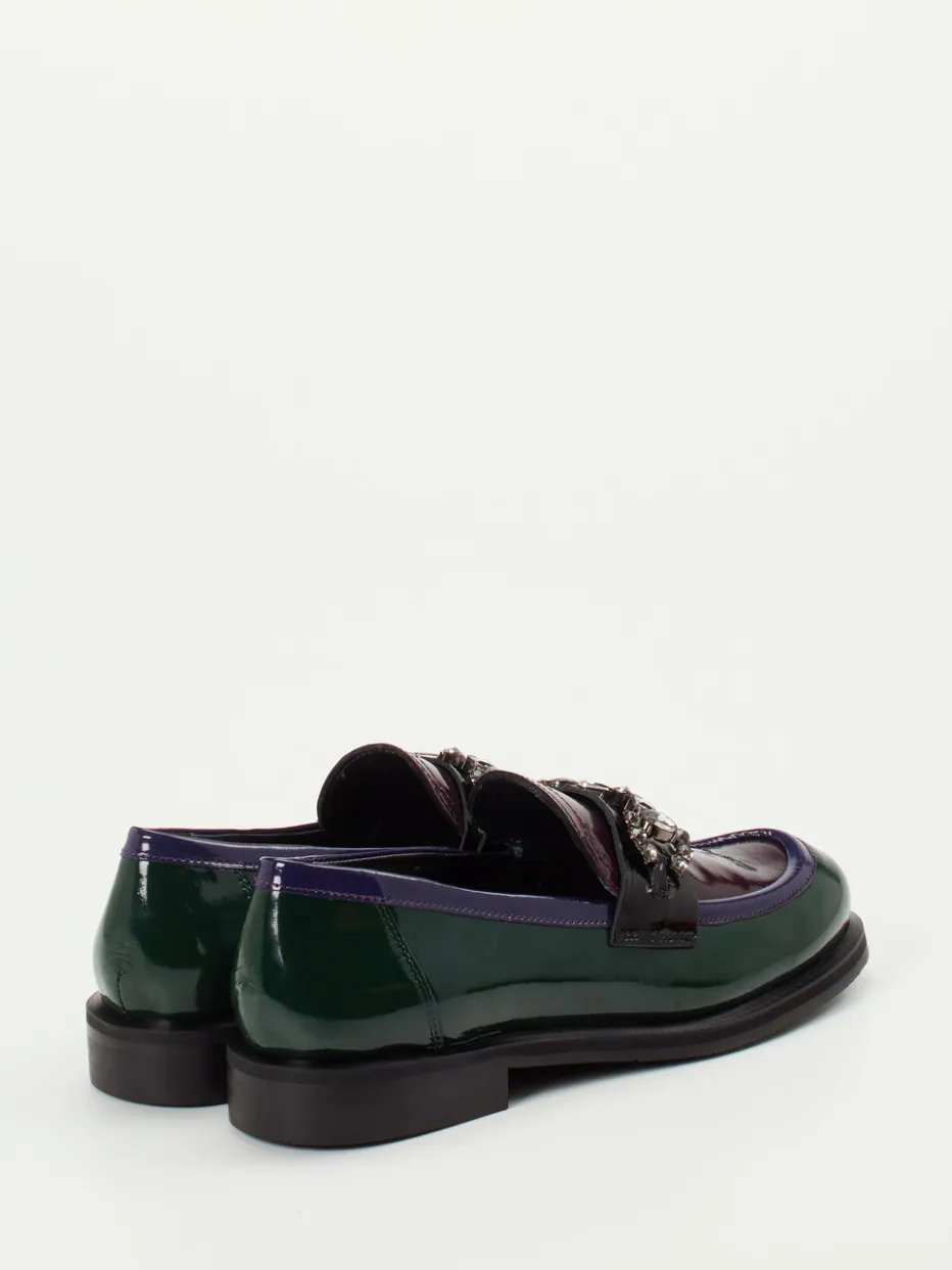 Ideal für modische City-Tage oder abendliche Events überzeugt das Modell mit flaschengrünem Color-Blocking, maulbeerfarbenen Akzenten und einer kontrastierenden Mokassinnaht in Violett. Hochwertiges Lackleder trifft auf eine klassische Silhouette in Schlupfform, ergänzt durch eine schwarze Zierspange mit rauchfarbenen Glitzersteinen. Die strukturierte Gummisohle samt Blockabsatz sorgt für ein stabiles Tragegefühl, das Innenfutter aus Kalbleder mit gepolstertem Fußbett für angenehme Bequemlichkeit. Gekonnt inspiriert von 90er-Jahre-Vibes und dem Herbsttrend Statement-Loafer lässt sich das Modell ideal zu minimalistischen Kleidern oder glänzenden Accessoires stylen.