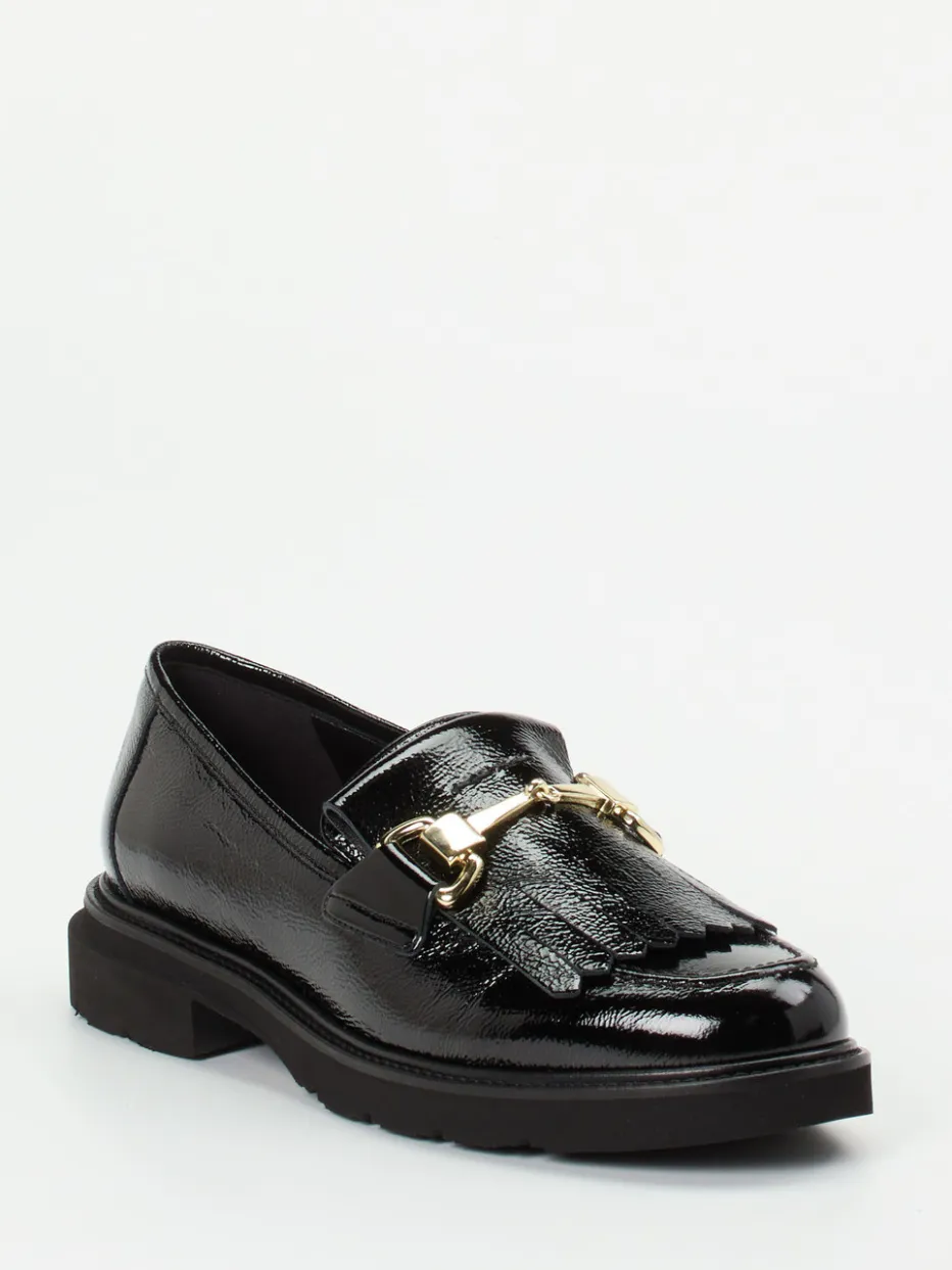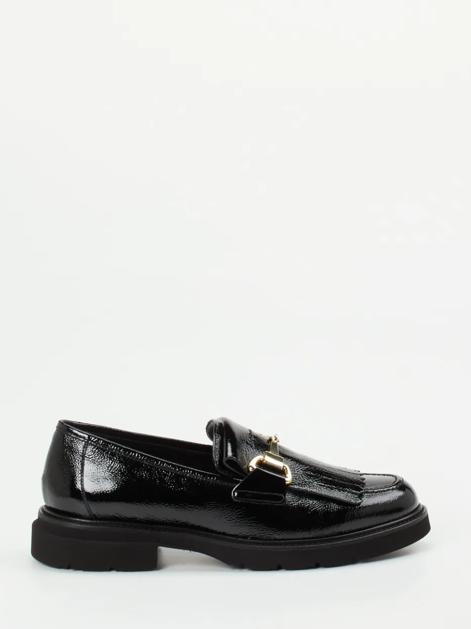 Klassischer Chic trifft auf zeitgemäße Eleganz: Lackleder und goldene Spange verleihen diesem Loafer einen edlen Auftritt – ideal für Büro und Freizeit.