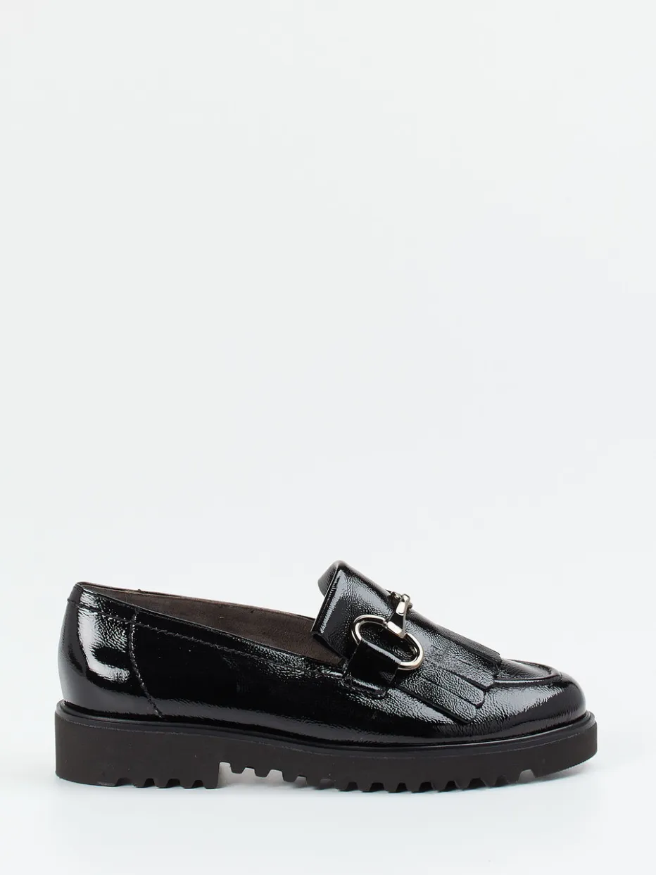 Preppy-Chic trifft Komfort.Paul Green präsentiert mit diesem schwarzen Loafer einen eleganten Damenhalbschuh mit sportivem Touch. Ideal bei Meetings oder City-Spaziergängen vereint er glänzendes Knautschlackleder mit einer femininen, flachen Silhouette. Der Schlupfschuh punktet mit markanter Fransengarnitur, silverfarbener Horsebit-Schnalle und flexiblen Elasteinsätzen. Die modisch profilierte Leichtzellsohle sorgt für souveränen Auftritt, während das Kalblederfutter und die gepolsterte Innensohle angenehmen Tragekomfort garantieren. Ein Stil-Favorit für minimalistisch-elegante Looks, passend zu Hosenanzügen oder Strickkleidern. Paul Green steht für sichtbare Qualität mit trendgerechter Detailverliebtheit.